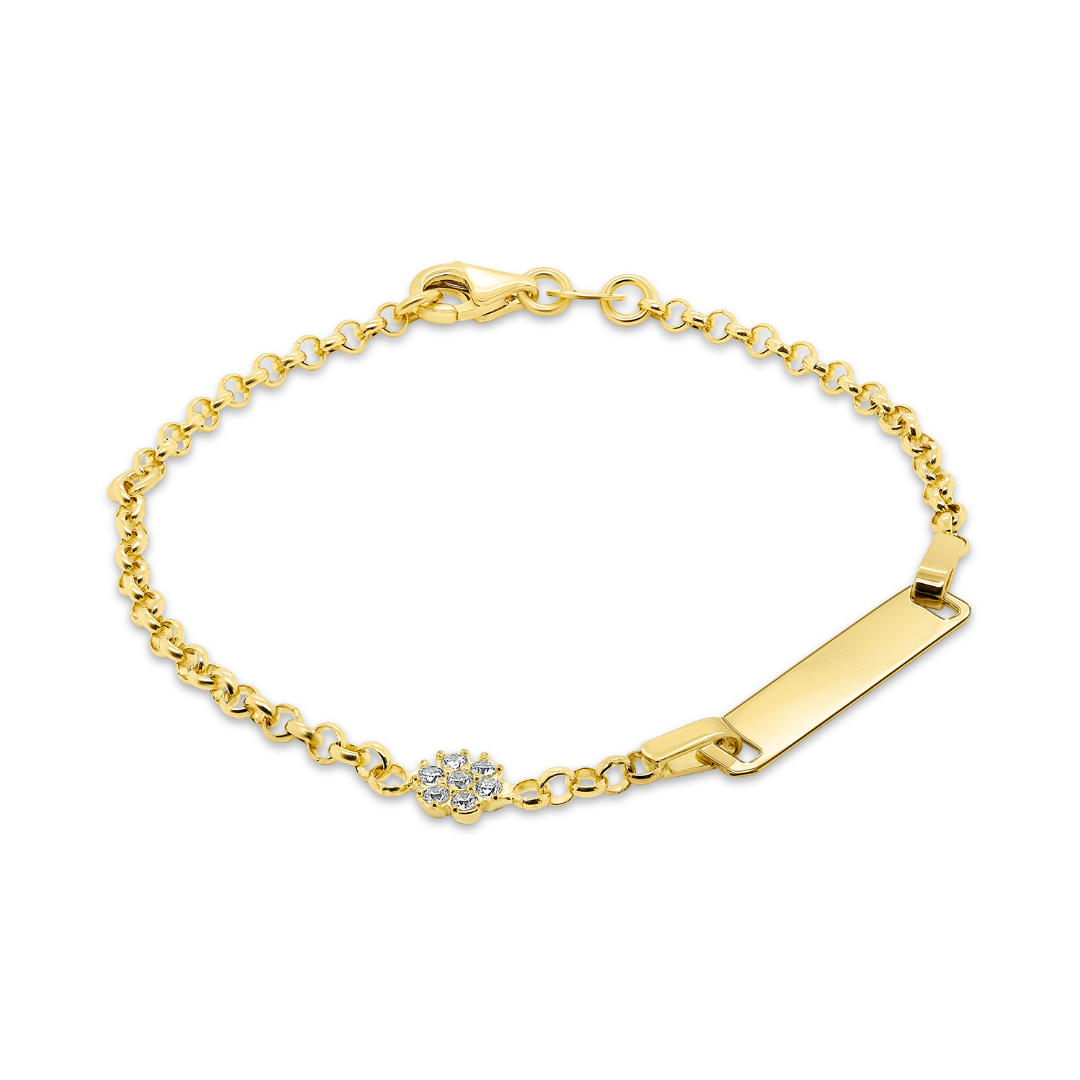 Brațară reglabilă din aur galben de 14K cu element tip floare și plăcuță pesonalizabilă prin gravare.