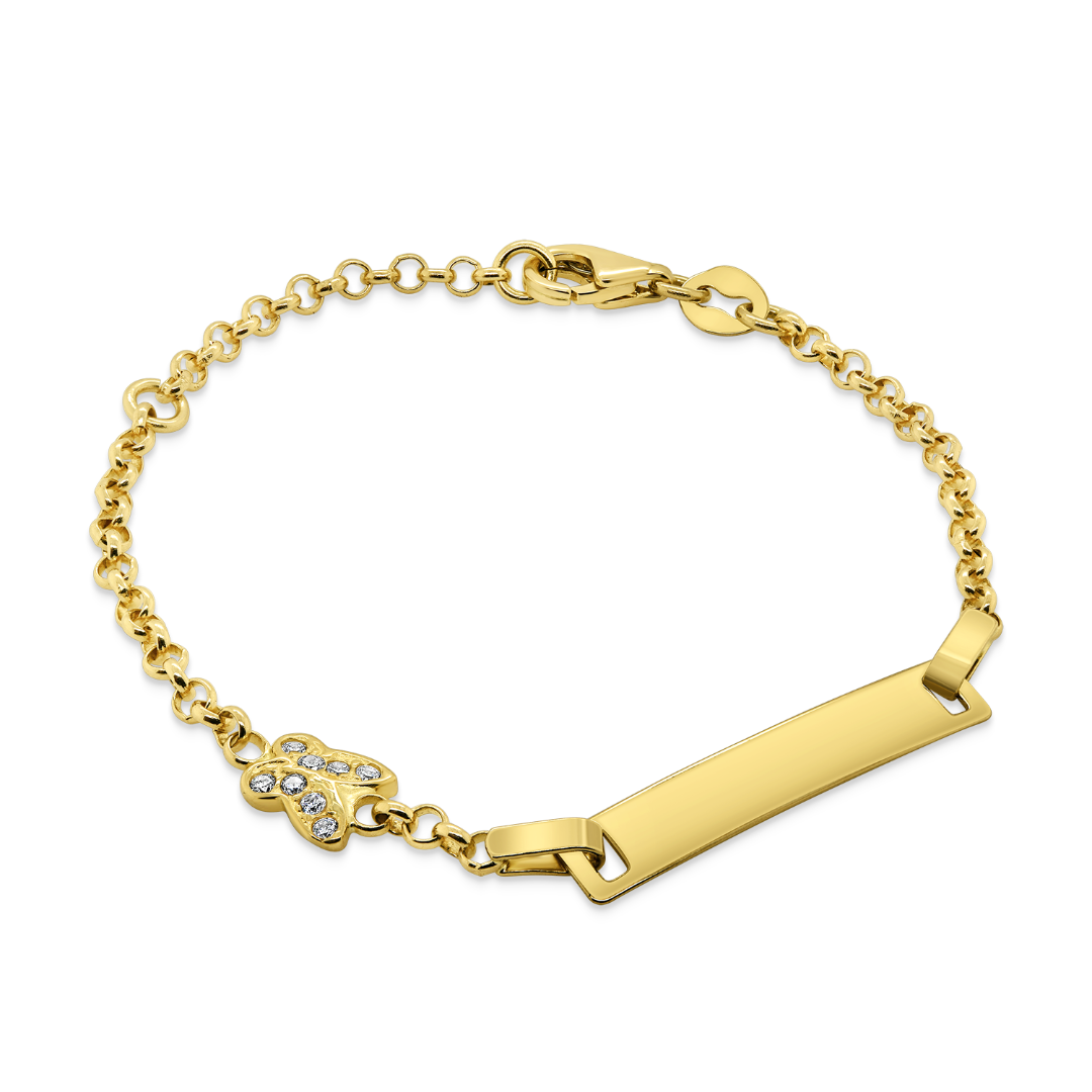 Brățară pentru copii din aur galben de 14K cu pandantiv fluture și plăcuță.