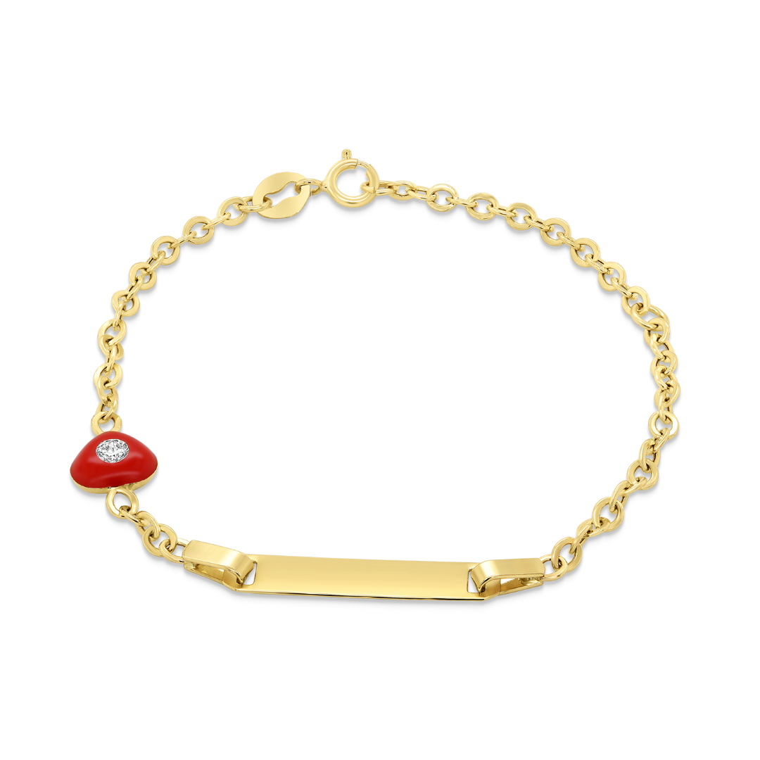 Brățară din aur galben de 14K cu element tip inimioară cu Email și plăcuță personalizabilă prin gravare.