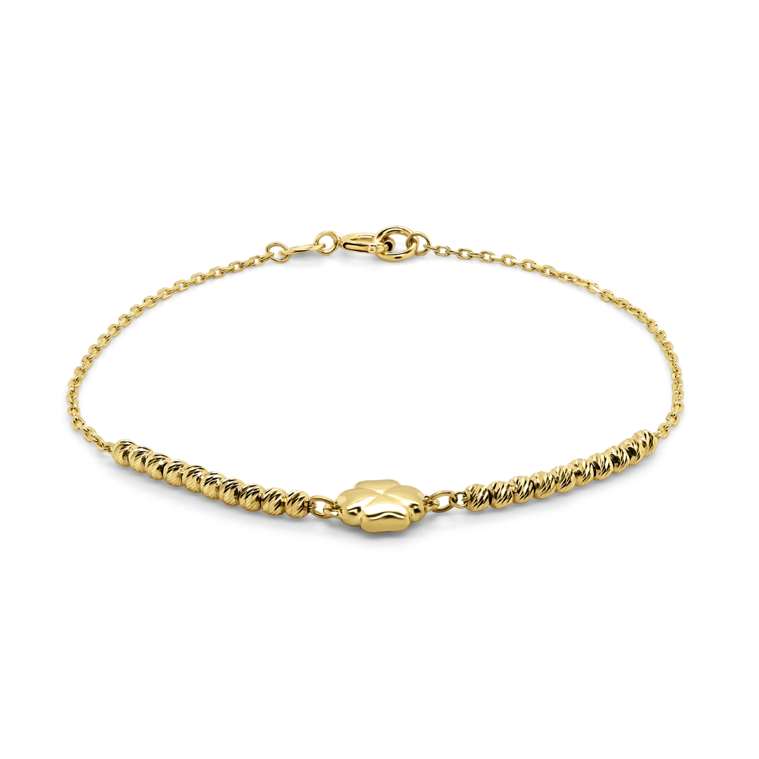Brățară din aur galben de 14K, cu biluțe fațetate și pandant trifoi.