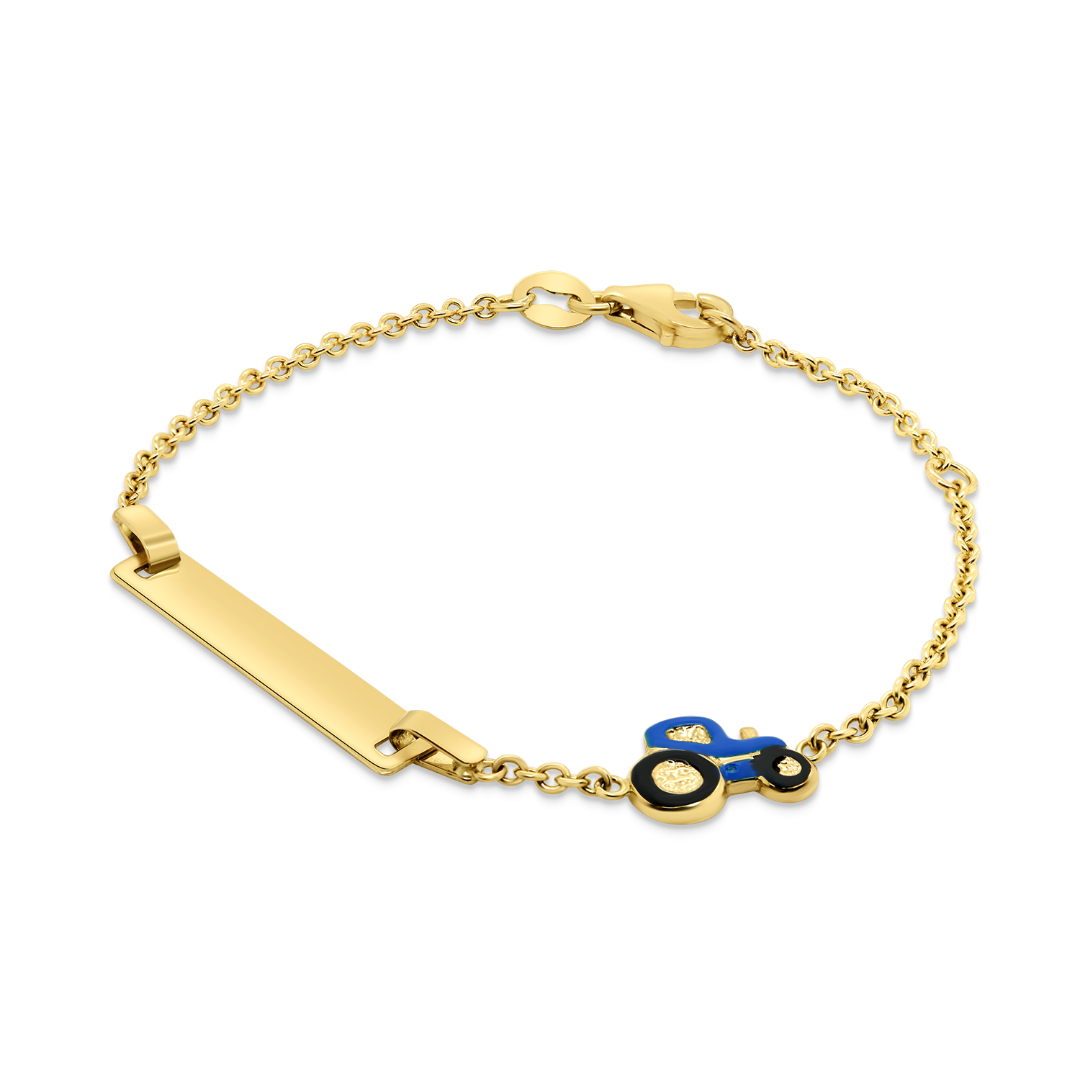 Brațară din aur 14K reglabilă, cu tractoraș și plăcuță cu email. Aceasta poate fi personalizată prin gravare.
