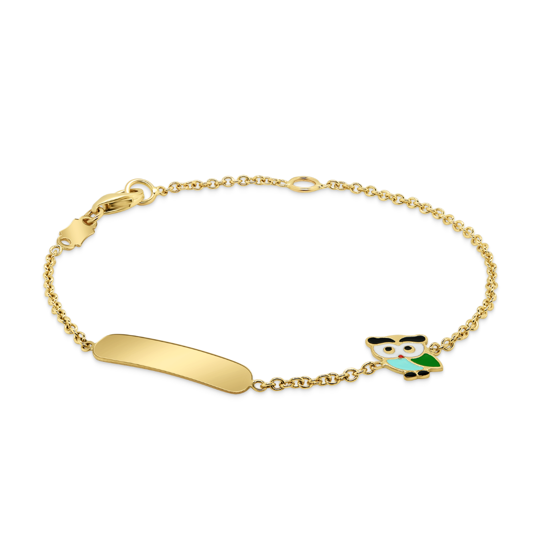 Brățară pentru copii din aur galben de 14K, cu pandantiv bufniță și plăcuță.