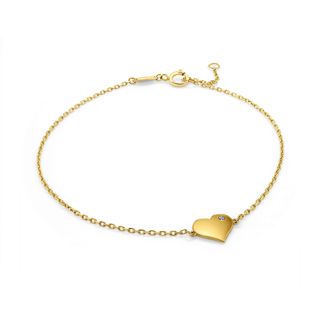 Brățară din aur galben de 14K cu element în formă de inimă și piatră cubic zirconia.