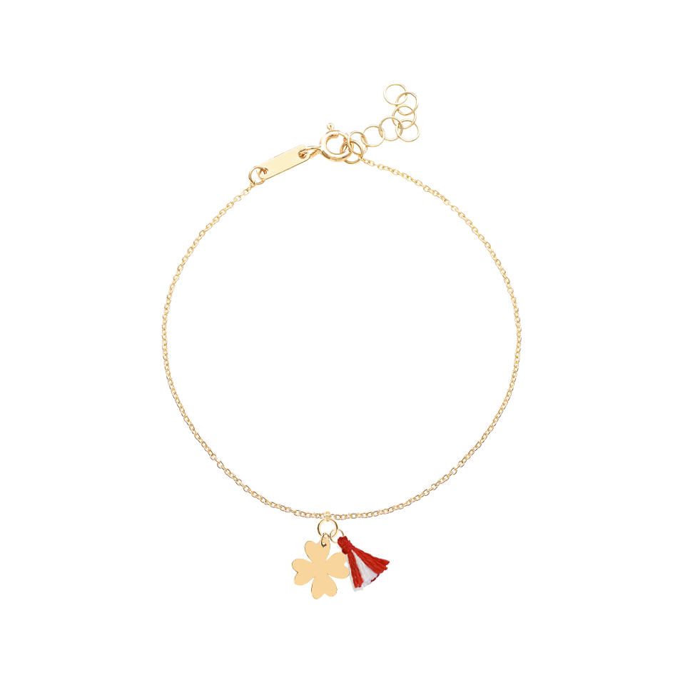 Brățară Mărțișor din aur galben de 14K, cu pandantiv trifoi și fir textil.
