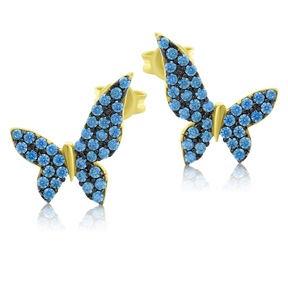 Cercei din aur galben de 14K, model fluturaș, cu pietre Cubic Zirconia albastre și rodiu negru.