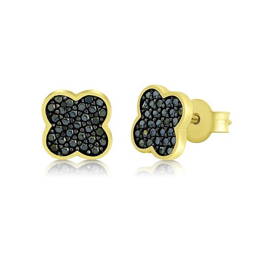 Cercei din aur galben de 14K, cu elemente tip trifoi și pietre cubic zirconia negre.