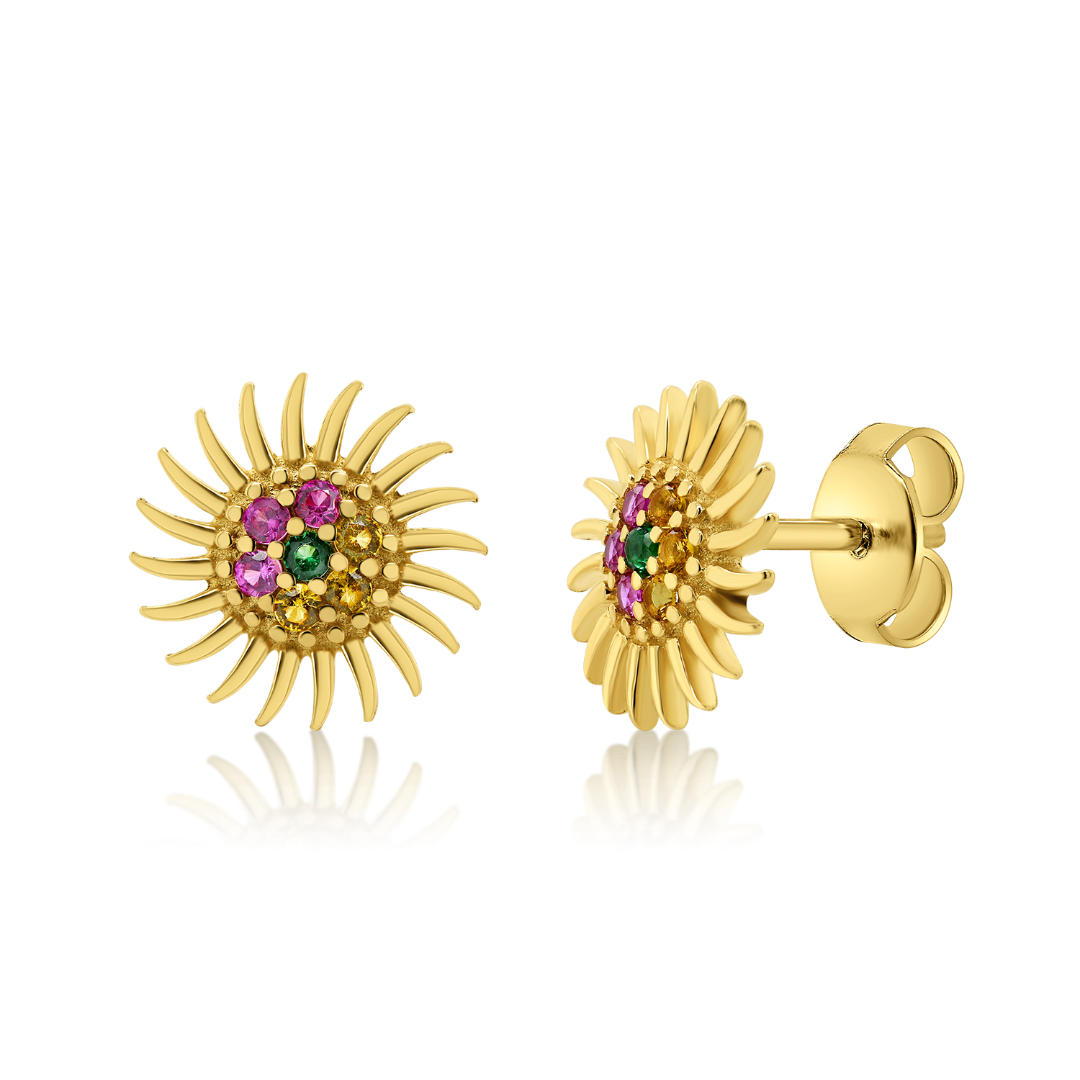 Cercei din aur galben de 14K, model soare cu pietre cubic zirconia colorate.