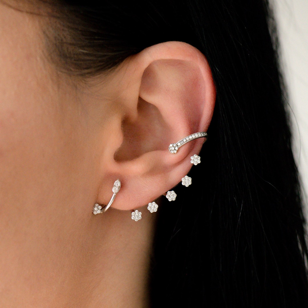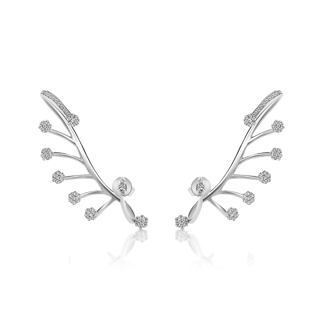 Cercei din aur alb de 14K, cu elemente în formă de floare încrustate cu pietre Cubic Zirconia albe.