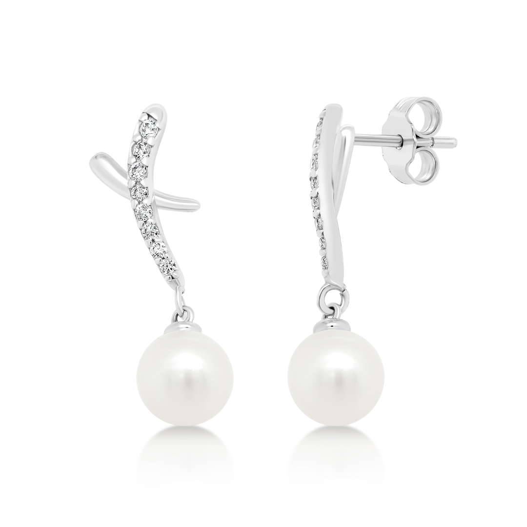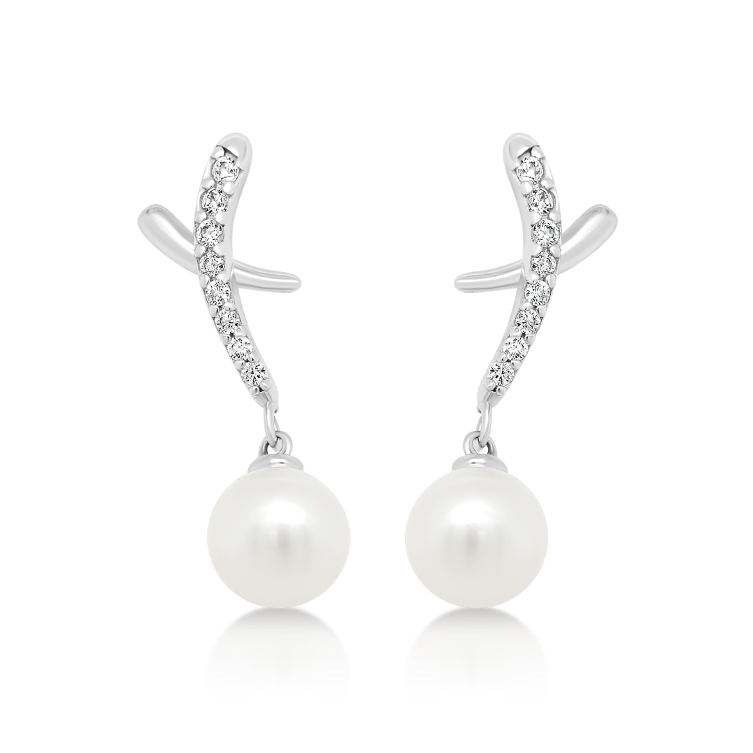 Cercei din aur alb de 14K, cu Perle de cultură și pietre cubic zirconia incolore.