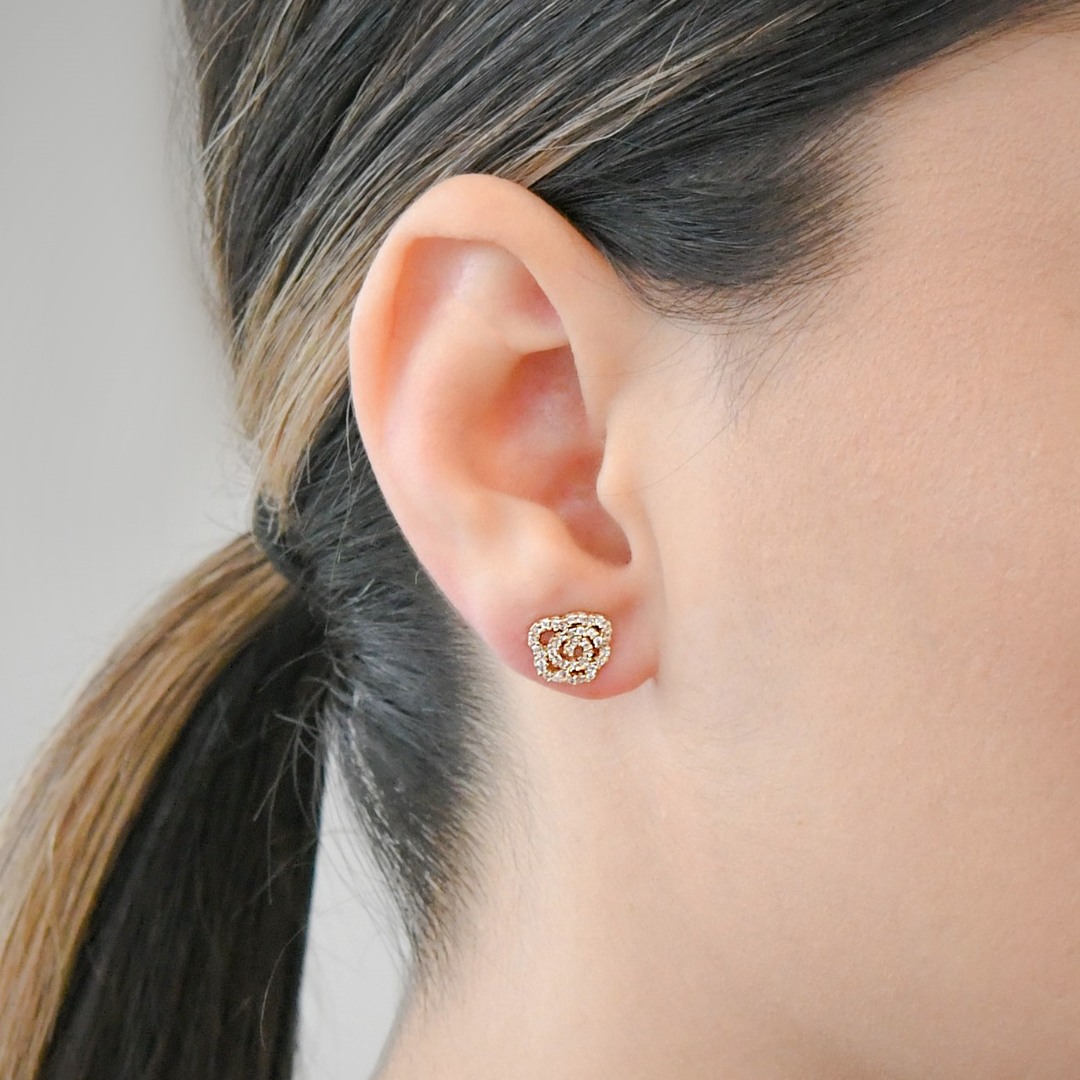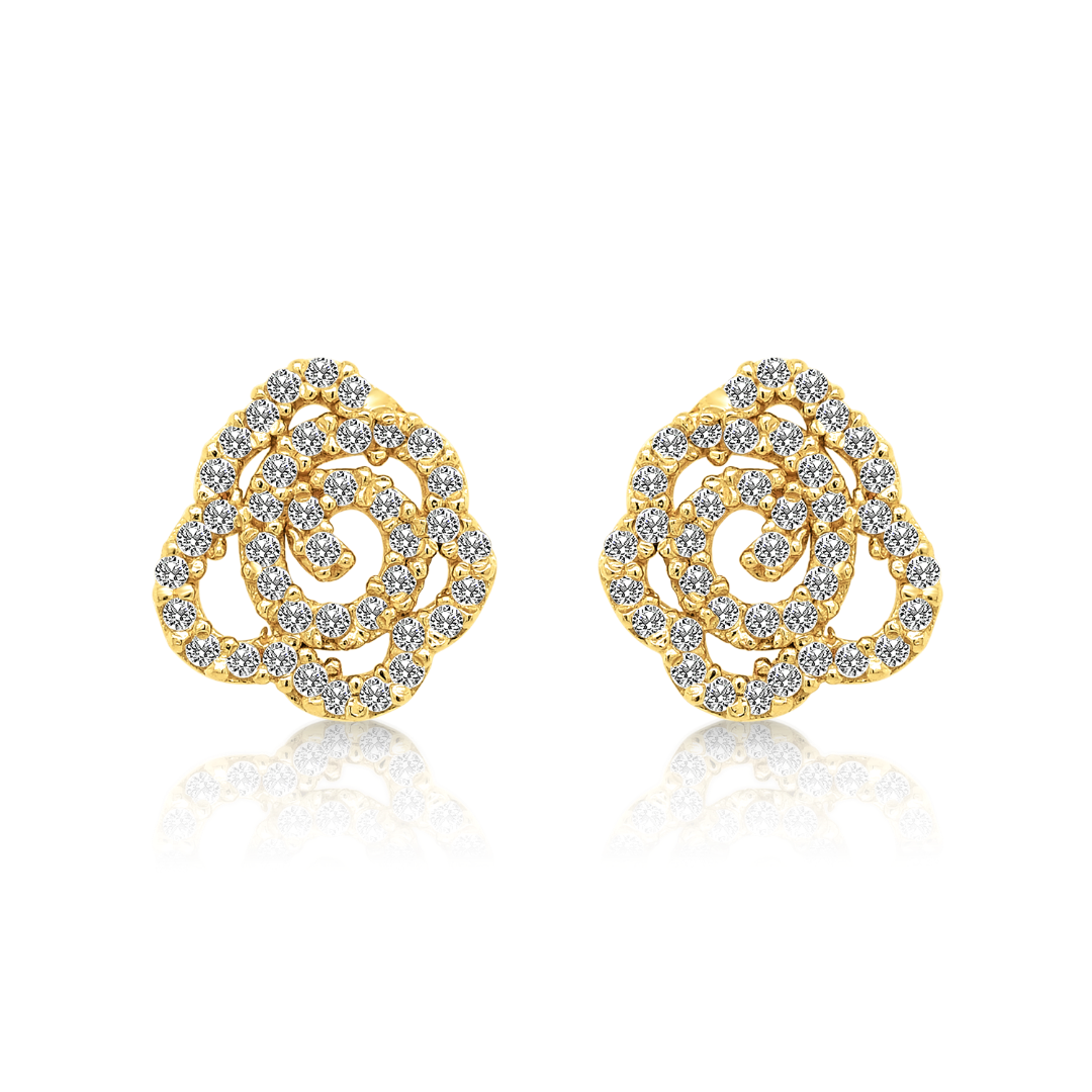 Cercei în formă de floare din aur galben de 14K, cu pietre Cubic Zirconia albe.
