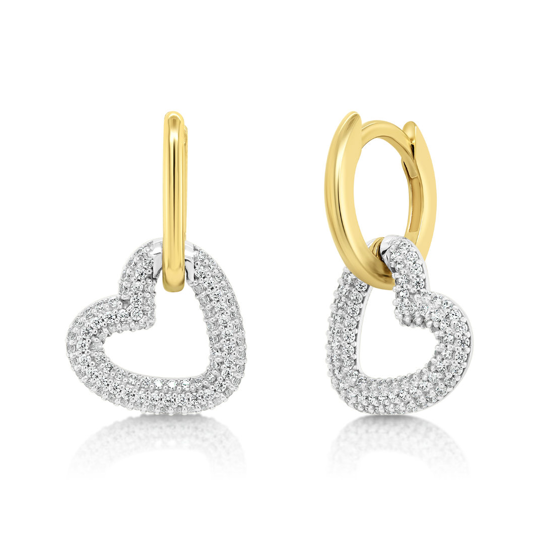 Cercei din aur galben de 14K, cu elemente din aur alb și pietre cubic zirconia.