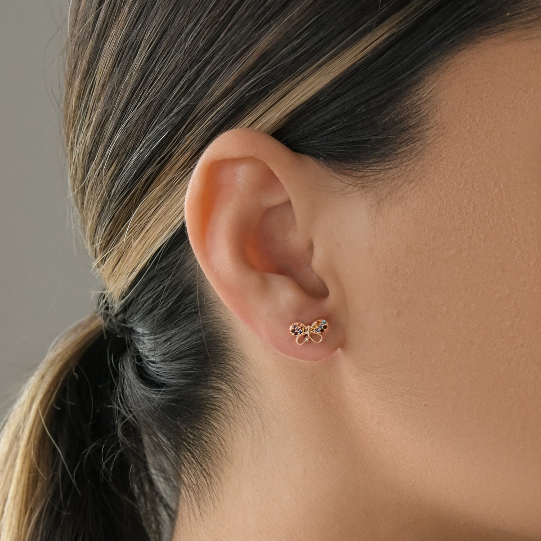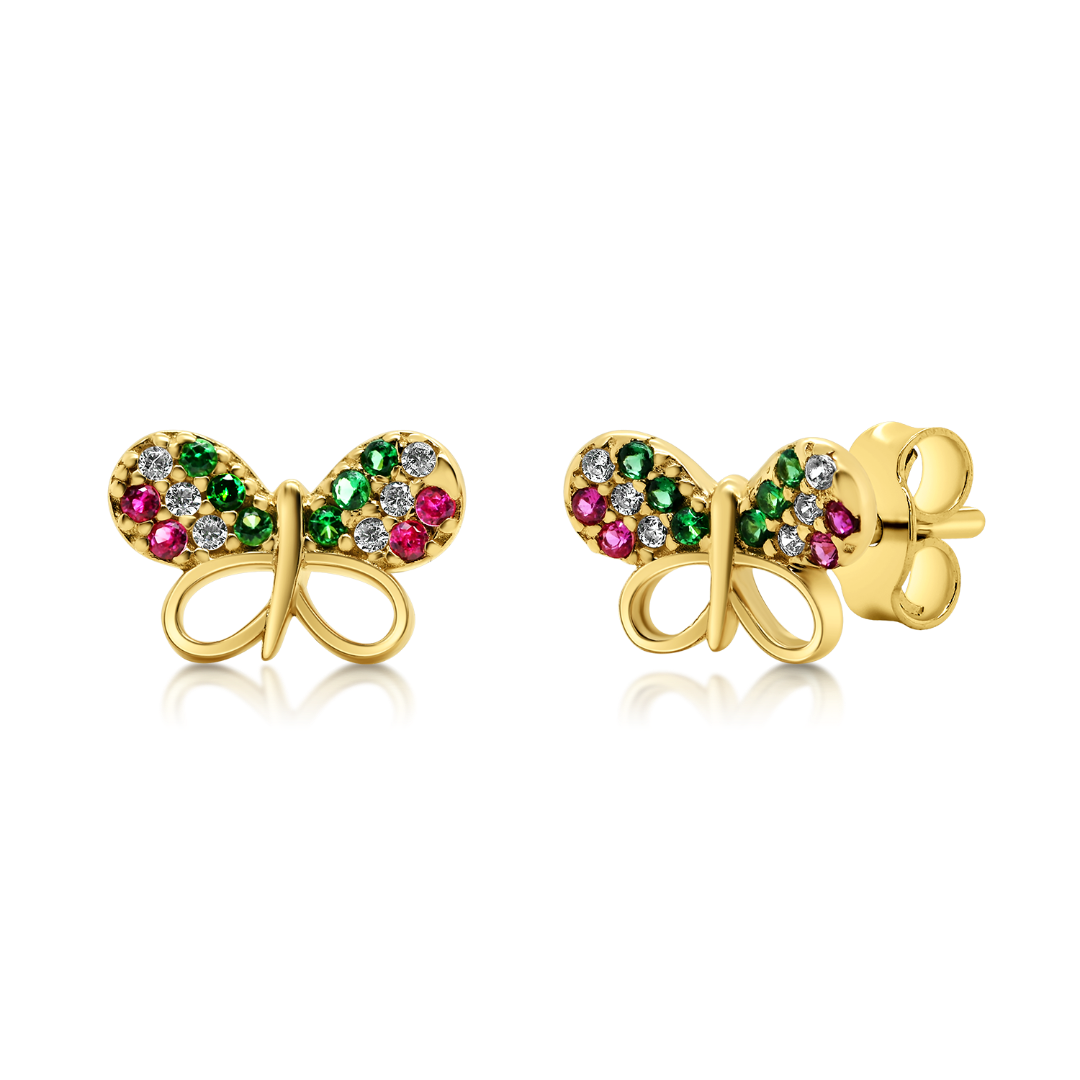 Cercei în formă de fluturi din aur galben de 14K cu pietre Cubic Zirconia colorate.