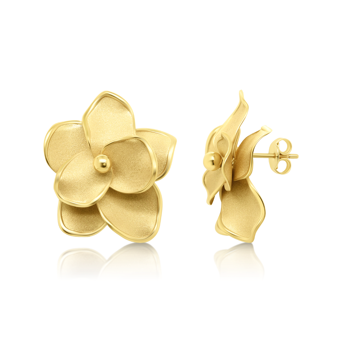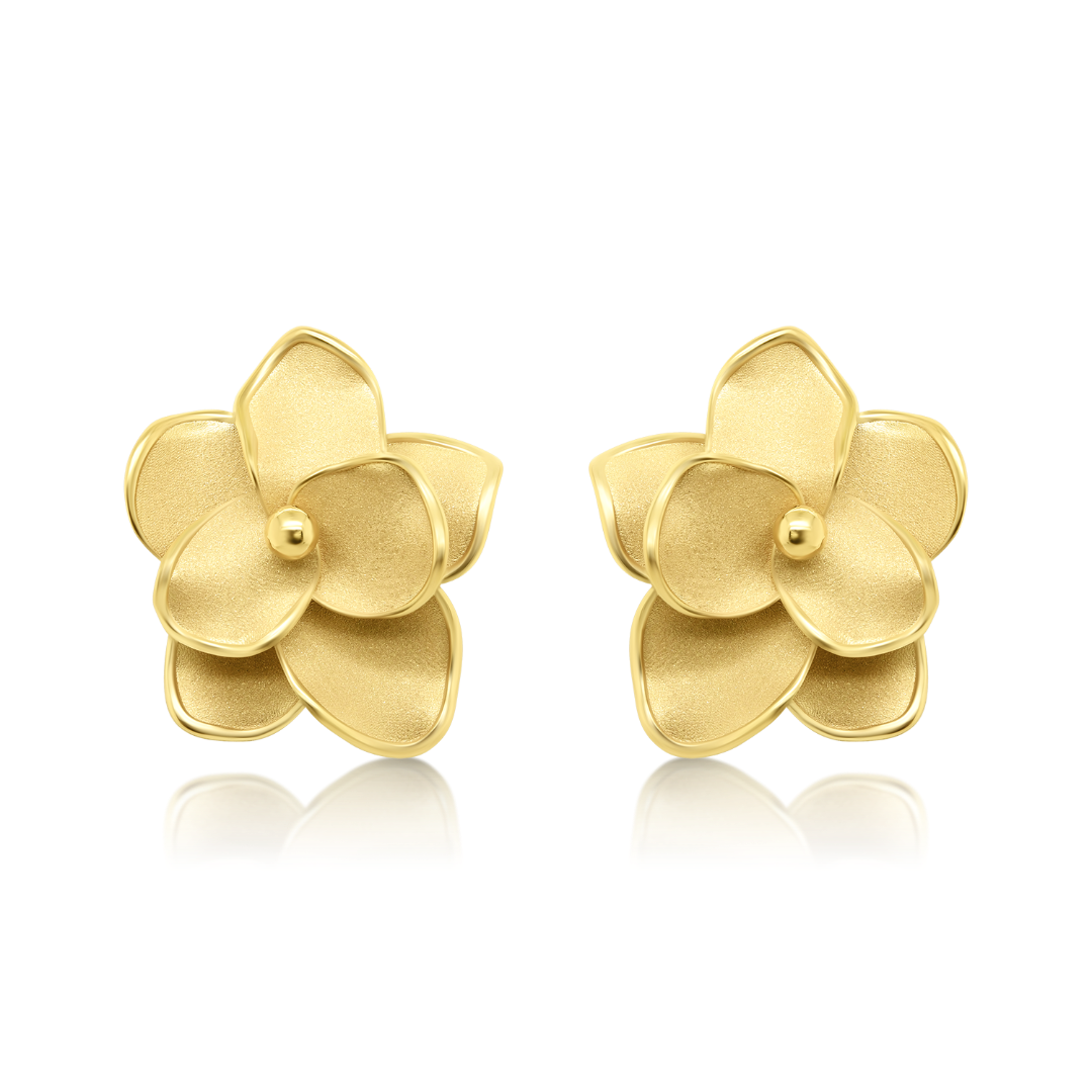 Cercei în formă de floare din aur galben de 14K cu efect satinat.