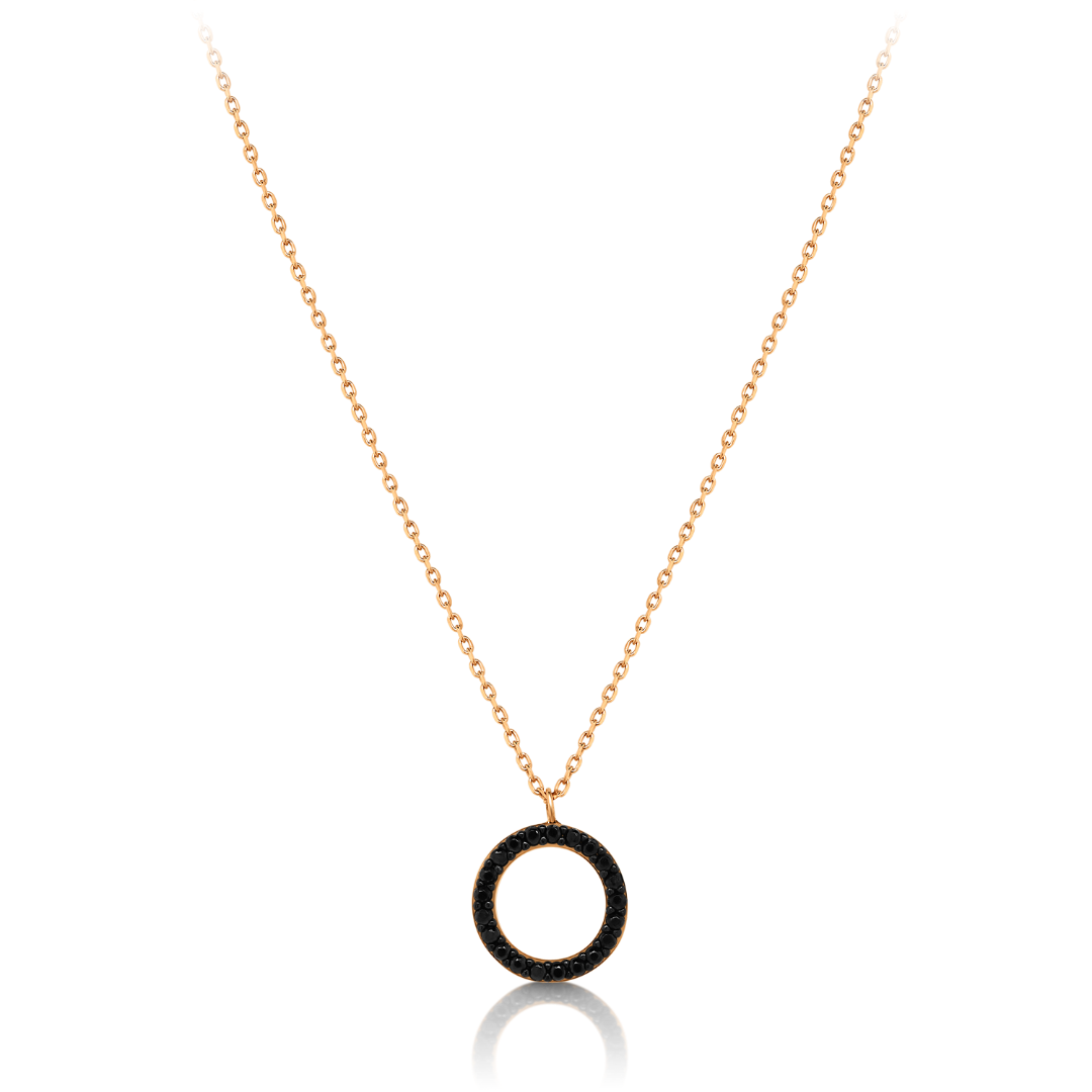 Lanț din aur roz de 14K și pandantiv rotund cu pietre Cubic Zirconia negre.
