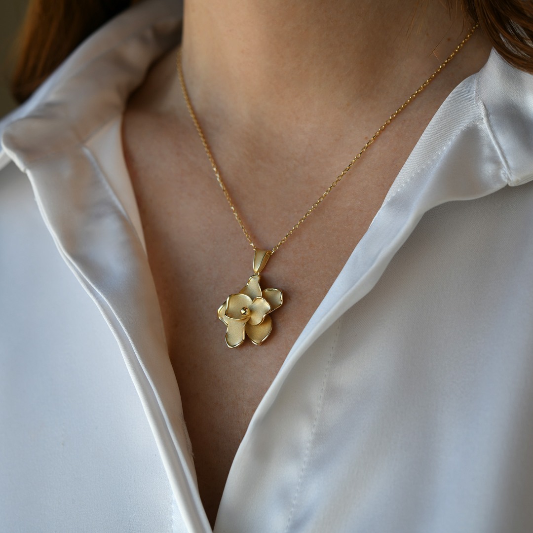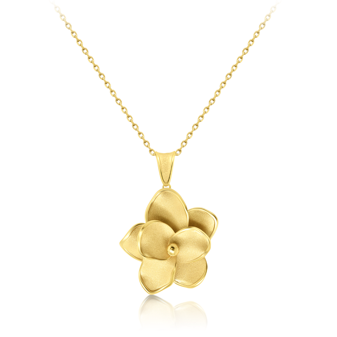 Lanț din aur galben de 14K și pandantiv floare cu efect satinat.