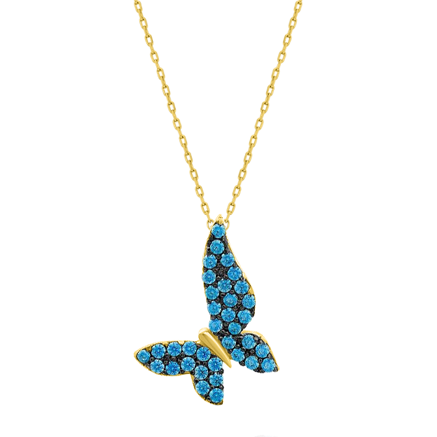 Lanț din aur galben de 14K și pandantiv fluture cu pietre Cubic Zirconia albastre.