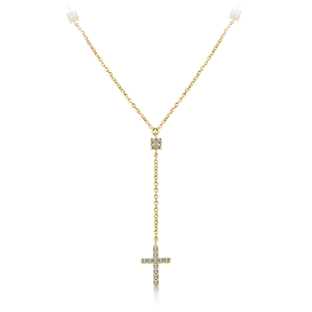 Rozariu din aur galben de 14K, cu pandantiv cruce și elemente cu pietre zirconia.