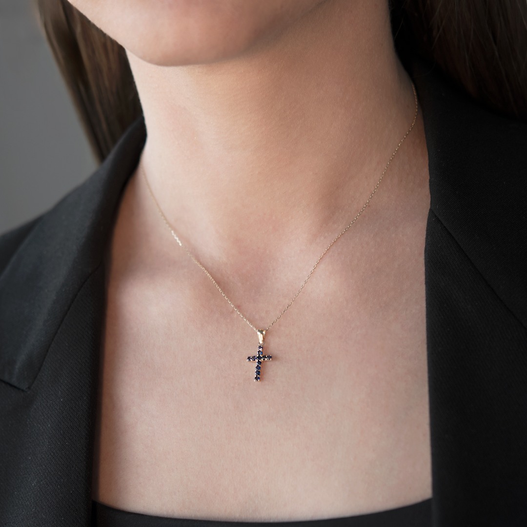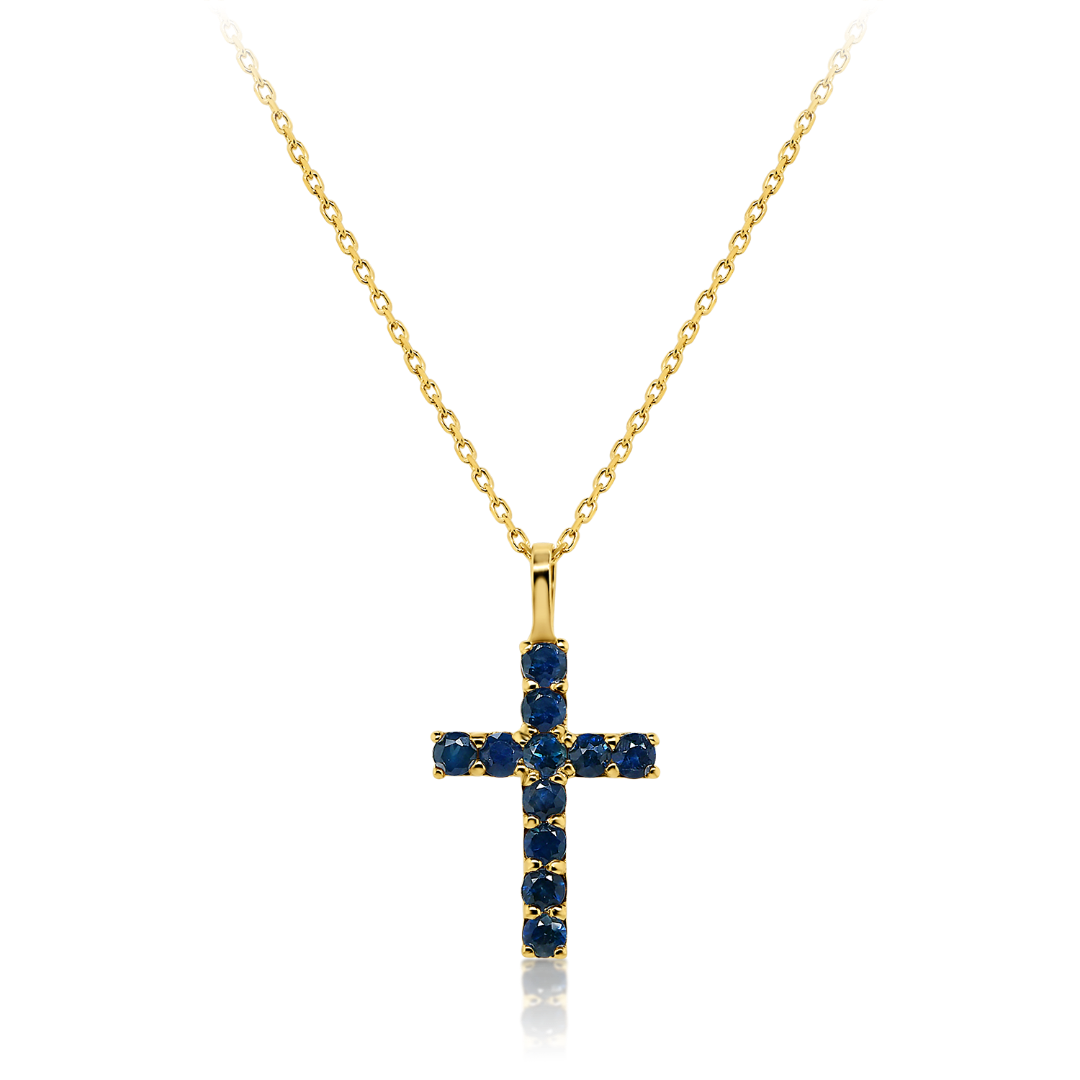 Lanț din aur galben de 14K și pandantiv cruce cu 11 Safire albastre.