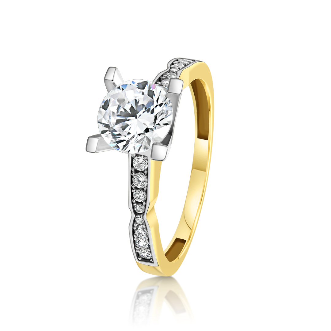 Inel din aur galben de 14K cu pietre Cubic Zirconia albe și rodiu alb.