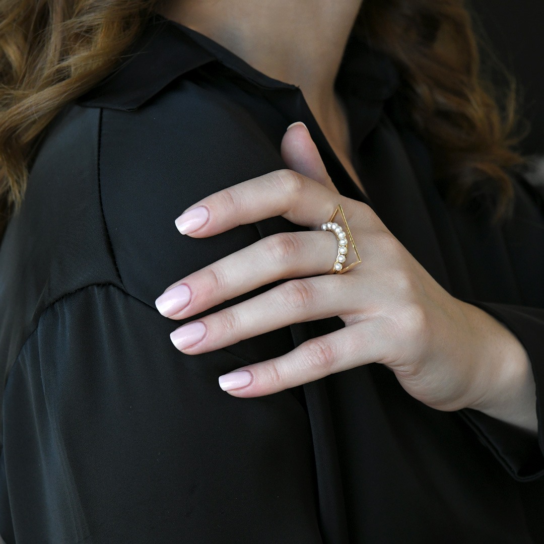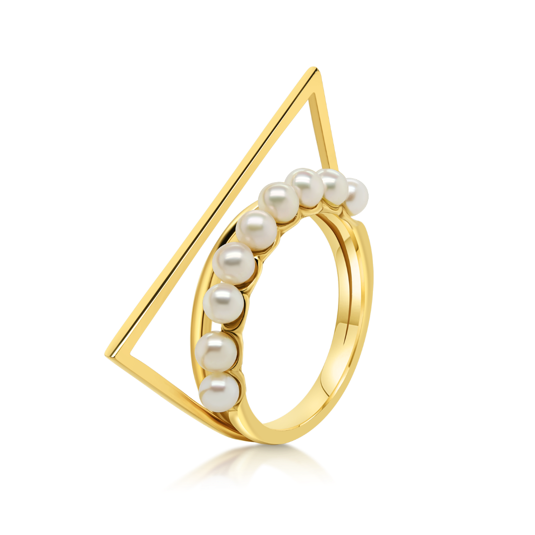 Inel din aur galben de 14K, cu element geometric și Perle.