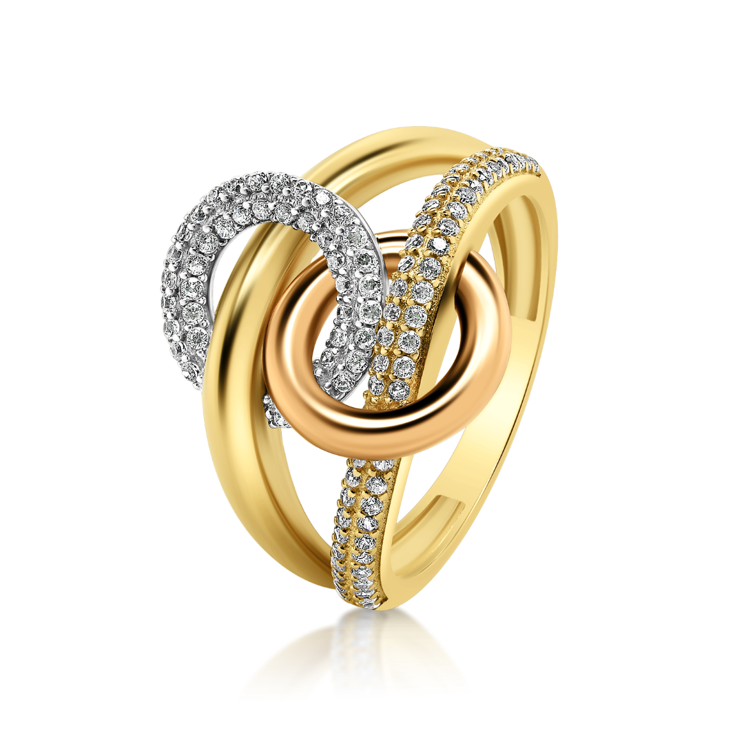 Inel din aur galben de 14K, cu element rodinat cu aur roz și element din aur alb încrustat cu pietre Cubic Zirconia albe.