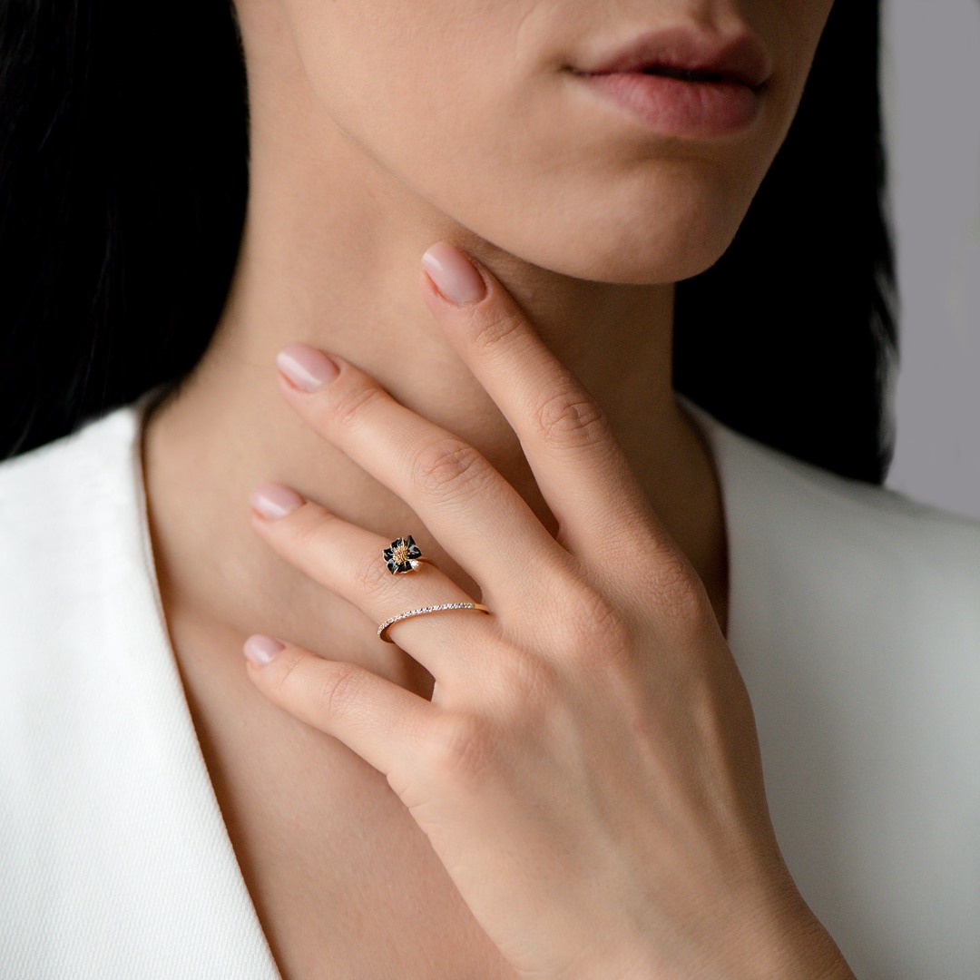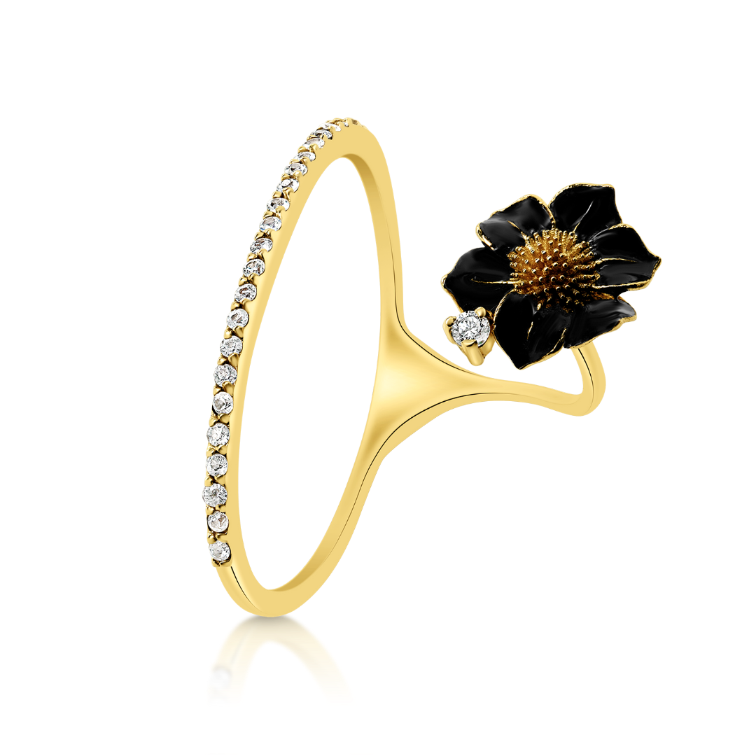 Inel din aur galben de 14K, cu pietre Cubic Zirconia albe și element în formă de floare cu email negru.