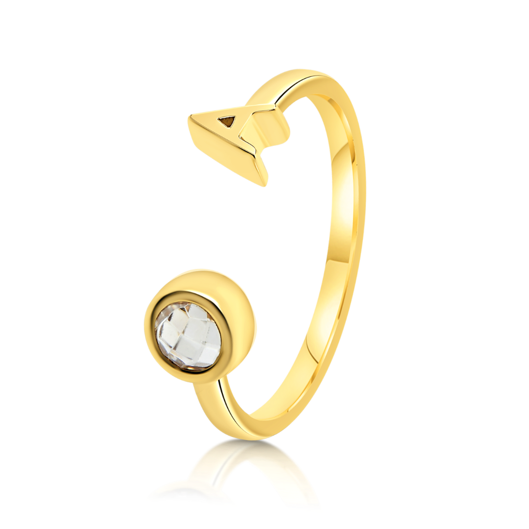 Inel din aur galben de 14K, cu element în forma literei A și piatră cubic zirconia.