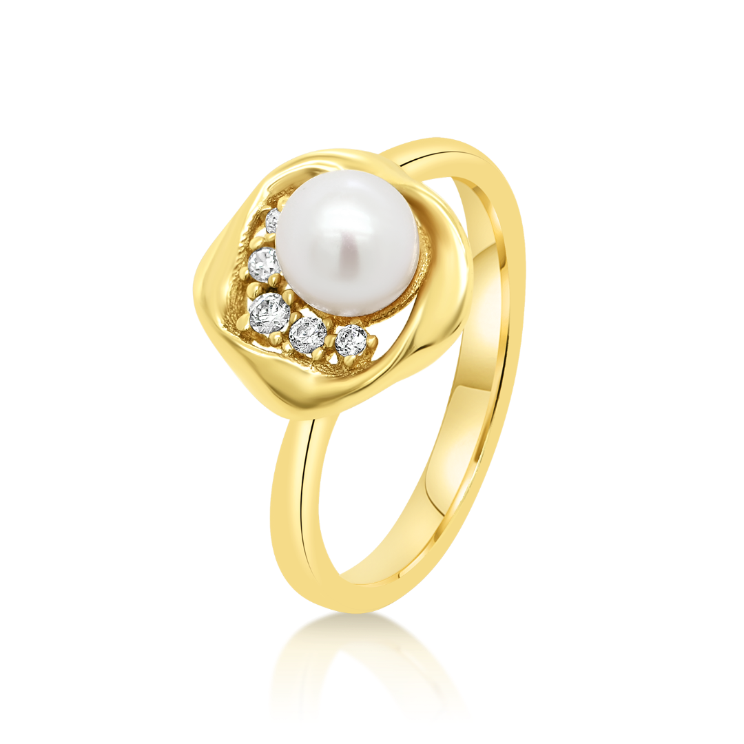 Inel din aur galben de 14K cu Perlă de cultură și pietre cubic zirconia.