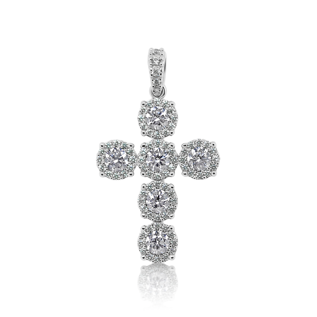 Pandantiv cruce din aur alb de 14K cu zirconii incolore.
