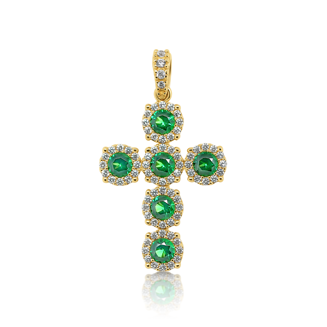 Pandantiv cruce din aur galben de 14K cu zirconii verzi și incolore.