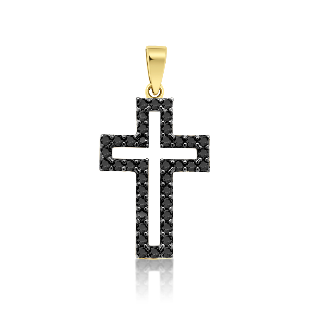 Pandantiv cruce din aur galben de 14K cu pietre cubic zirconia negre.