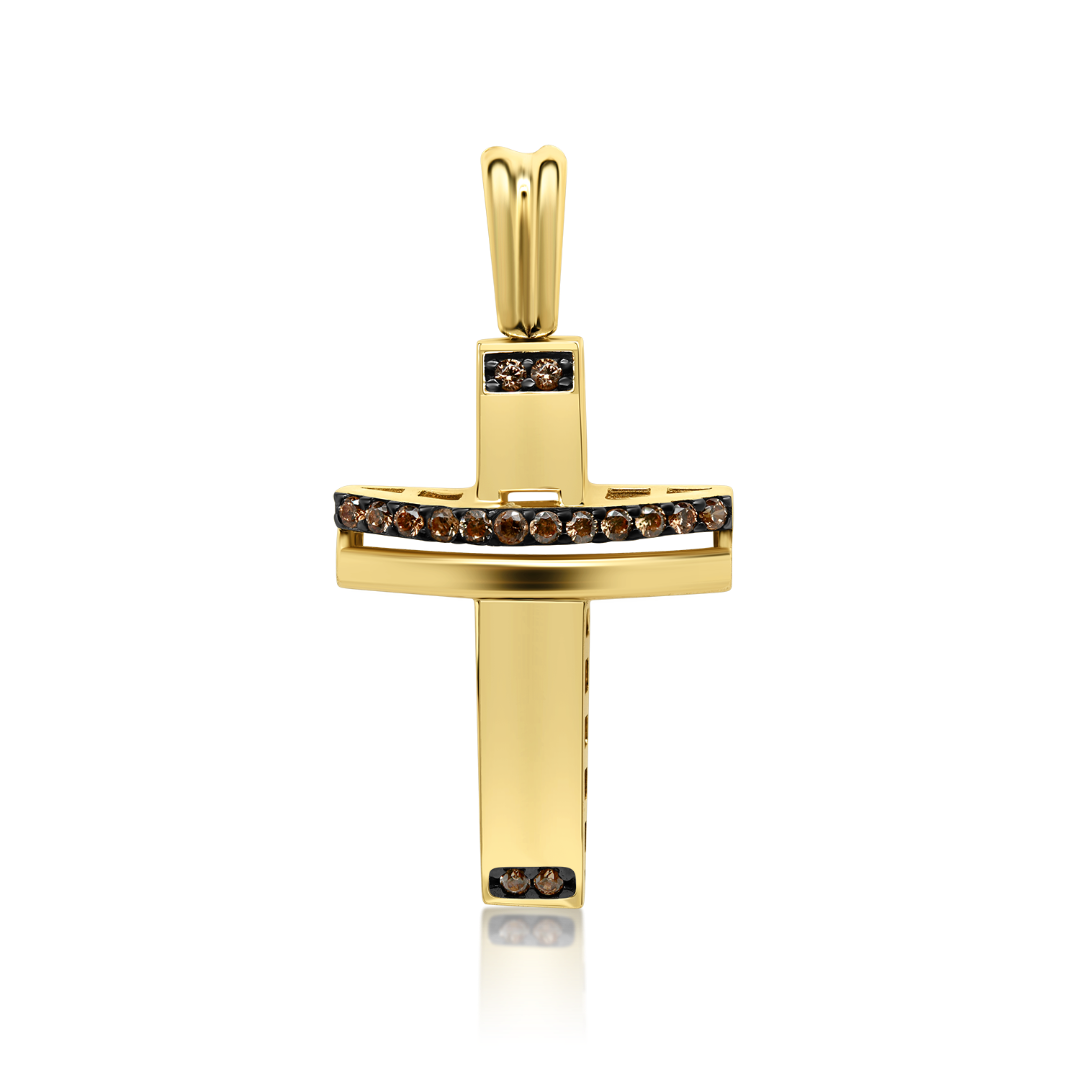 Pandantiv tip cruce din aur galben de 14K cu pietre Cubic Zirconia maro.