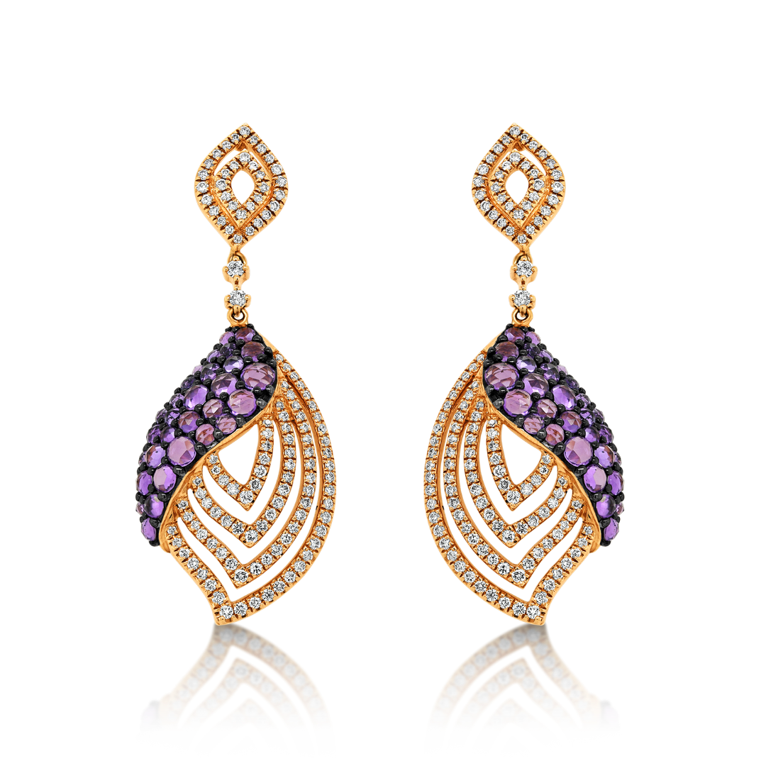 Cercei din aur roz de 18K cu 240 de Diamante naturale de 0.90ct. si 64 de Ametiste de 1.74ct.