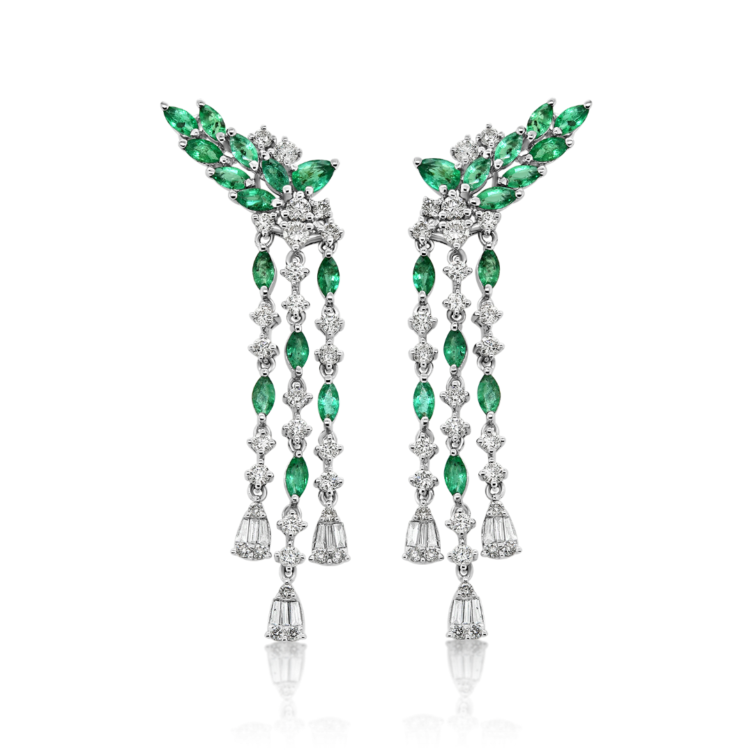 Cercei din aur alb de 18K, încrustați cu 60 de Diamante Round Brilliant de 1.18ct, 28 de Smaralde de 1.856ct și 18 Diamante Baguette de 0.156ct.