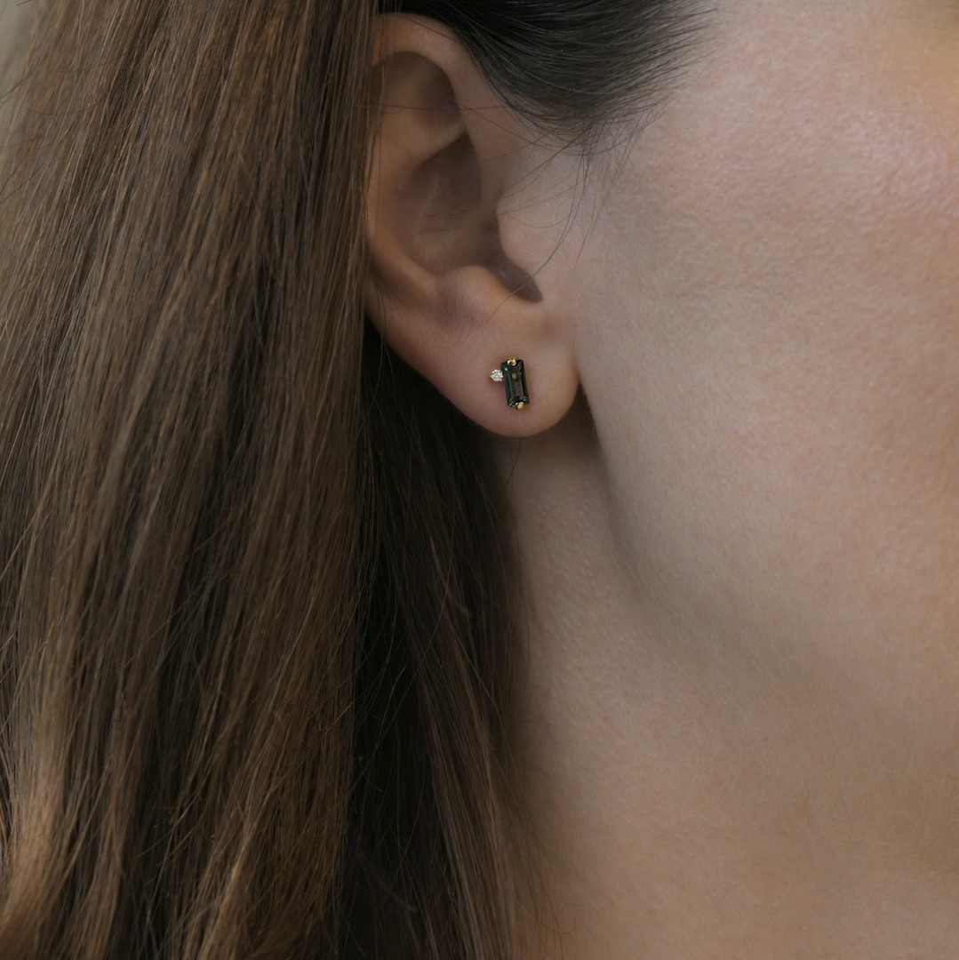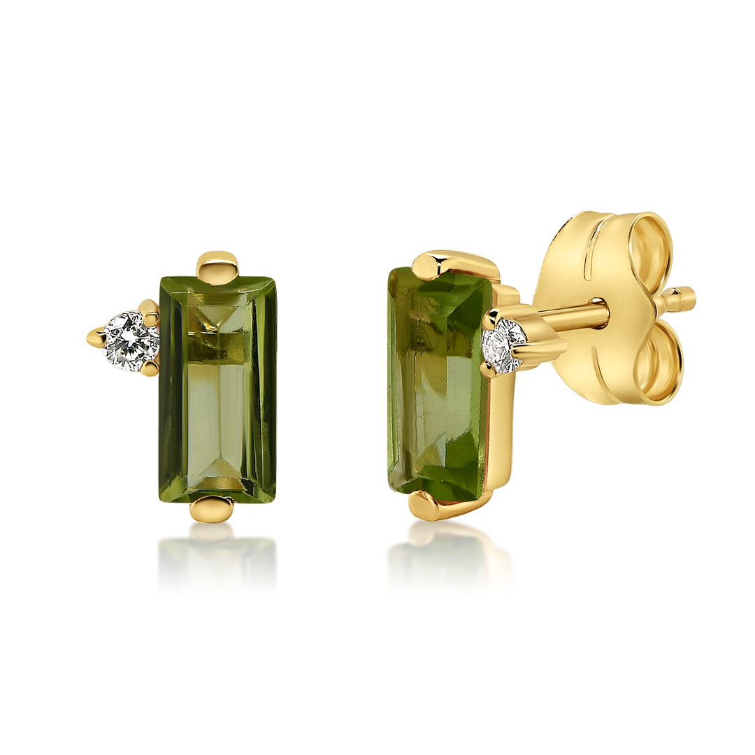 Cercei din aur galben de 14K cu două Diamante naturale și două Topaze verzi.