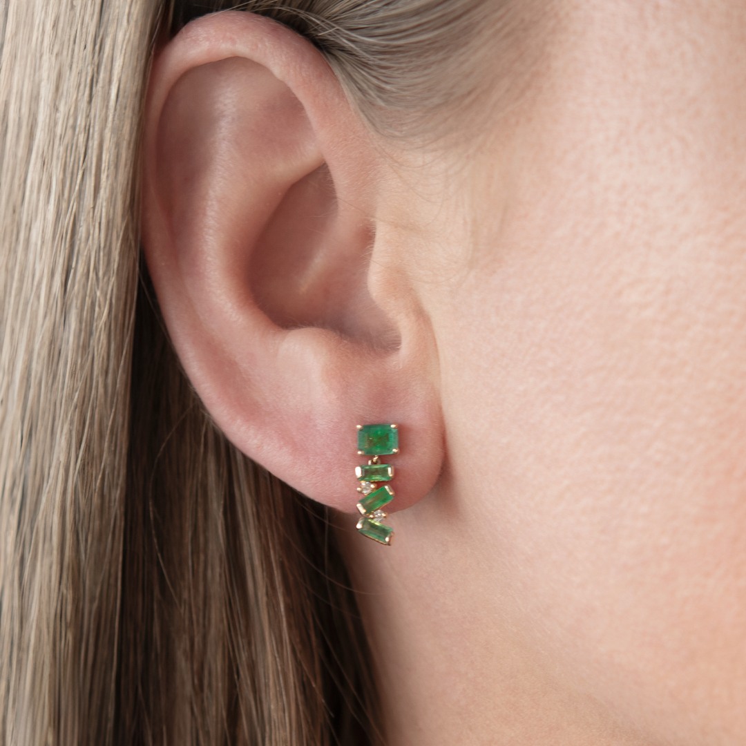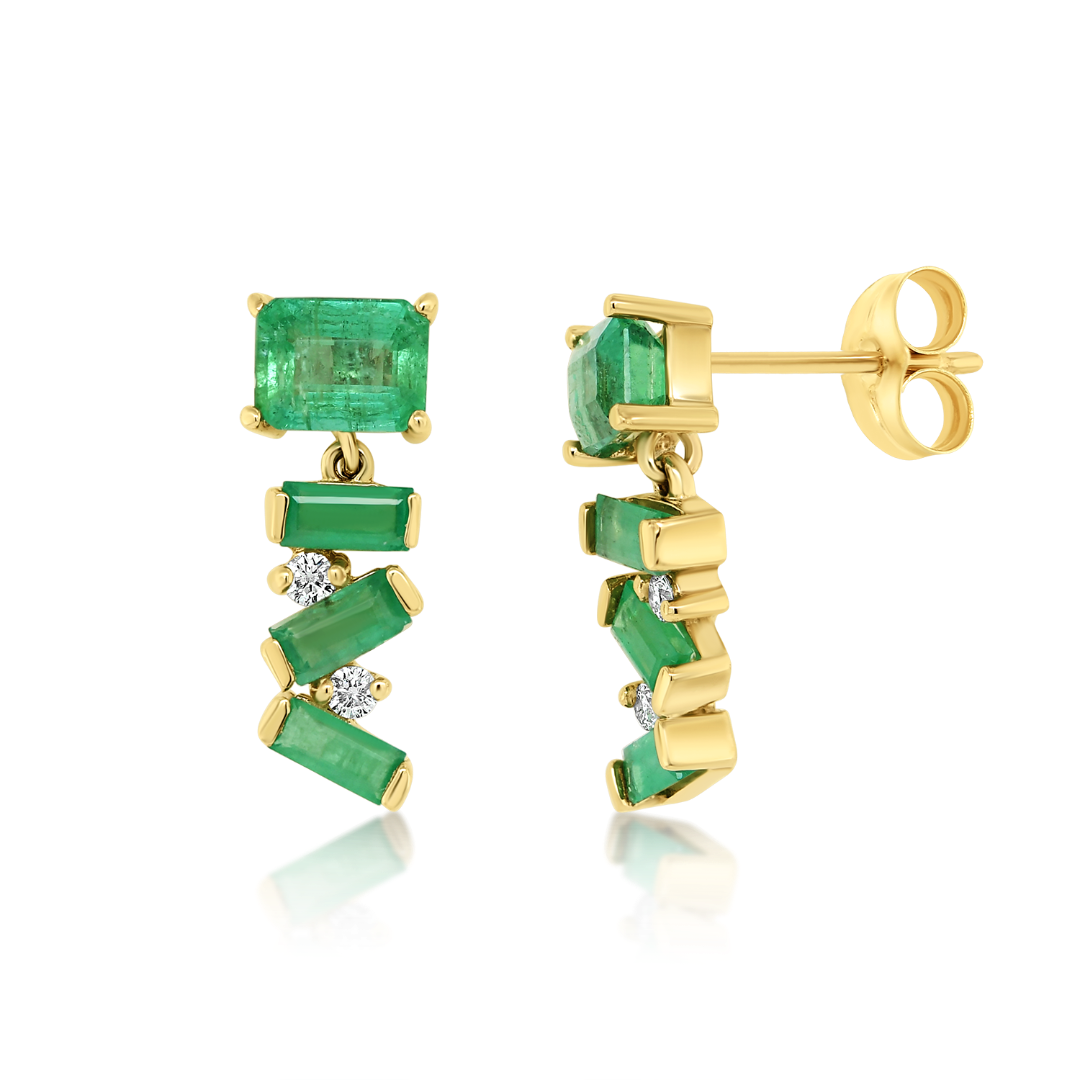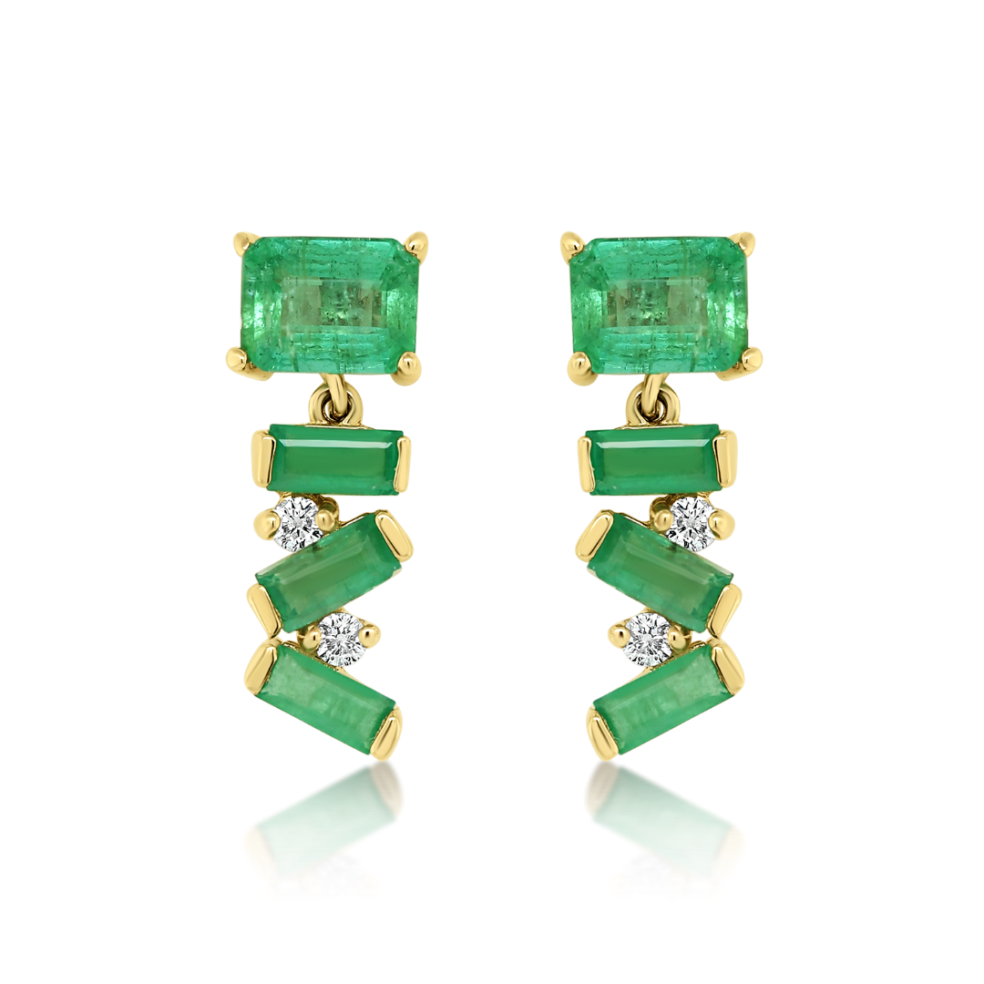 Cercei din aur galben de 14K, cu 8 Smaralde și 4 Diamante Round Brilliant naturale.