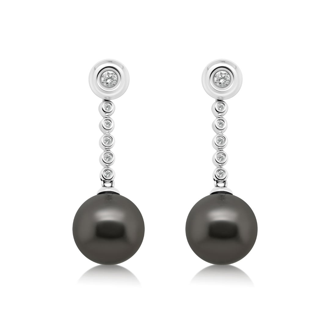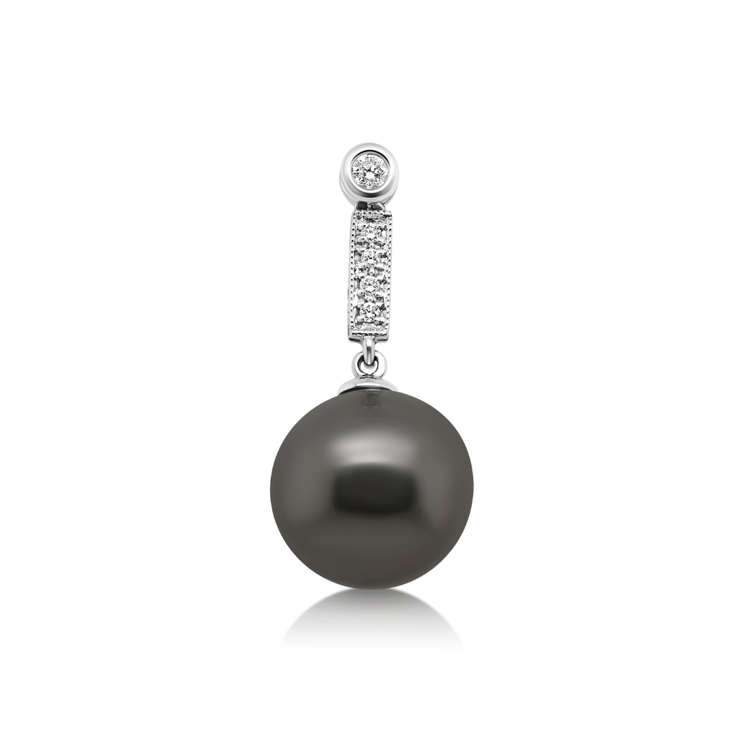 Set format din cercei și pandantiv din aur alb de 18K. Cerceii sunt încrustați cu Diamante Brilliant cut de 0.32ct și Perle, iar pandantivul este cu Diamante Brilliant cut de 0.10ct și Perlă.