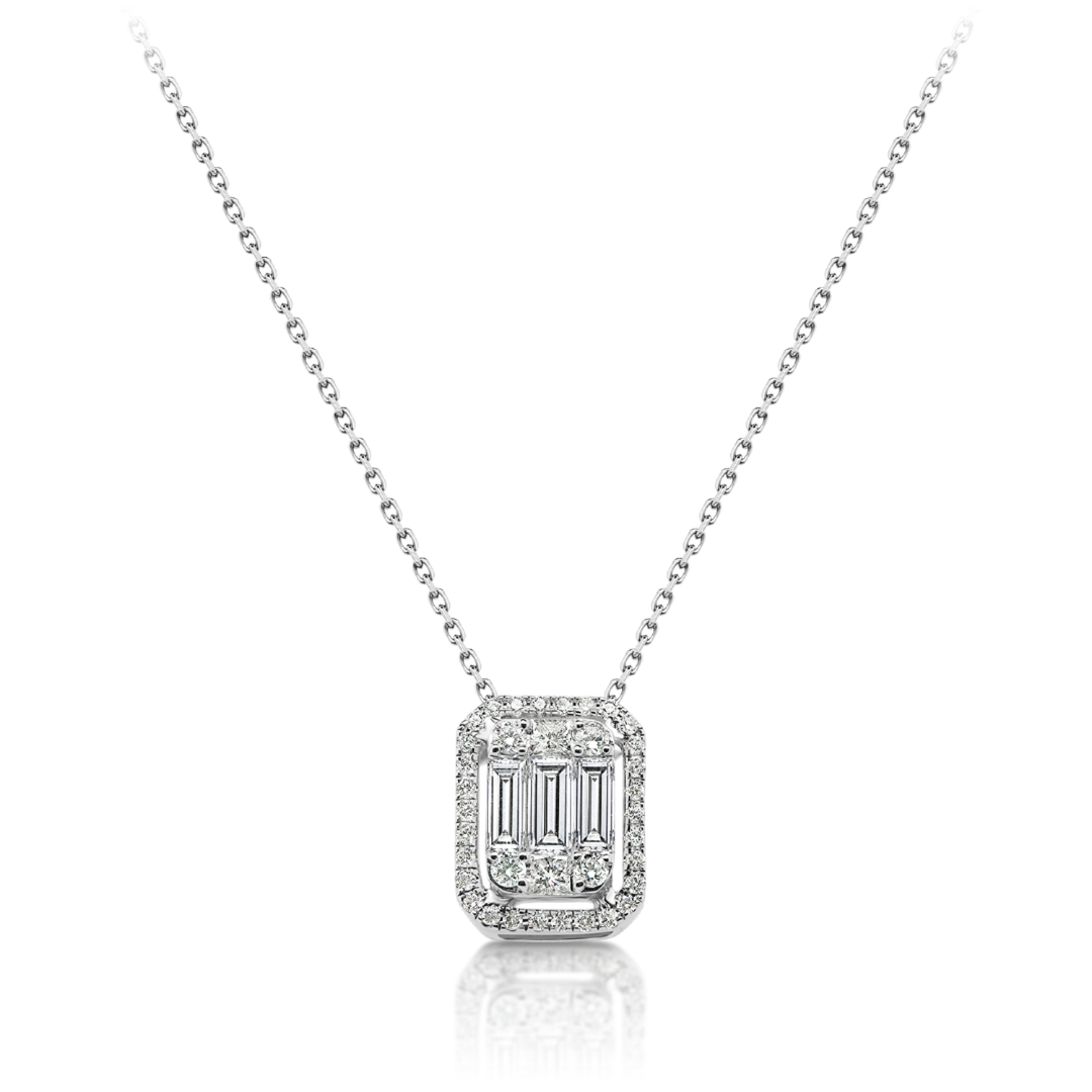 Lanț din aur alb de 18K și pandantiv încrustat cu Diamante naturale Baguette, Princess și Brilliant cut.