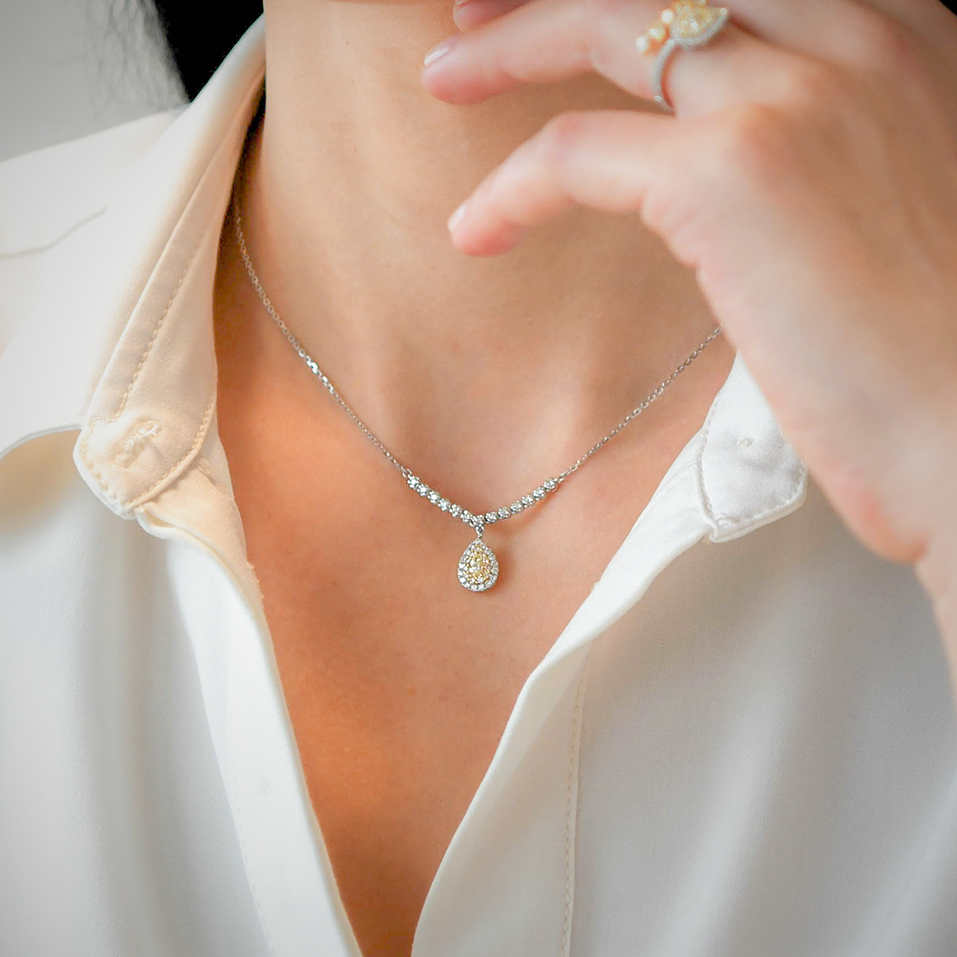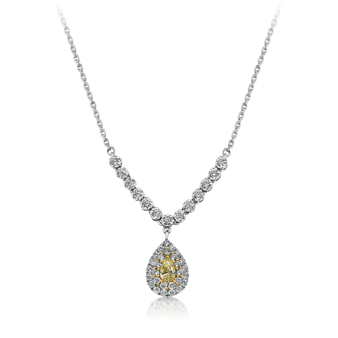 Lanț din aur alb de 18K și pandantiv încrustat cu 41 de Diamante Round Brilliant incolore de 0.528ct și un Diamant Fancy Pear de 0.178ct.