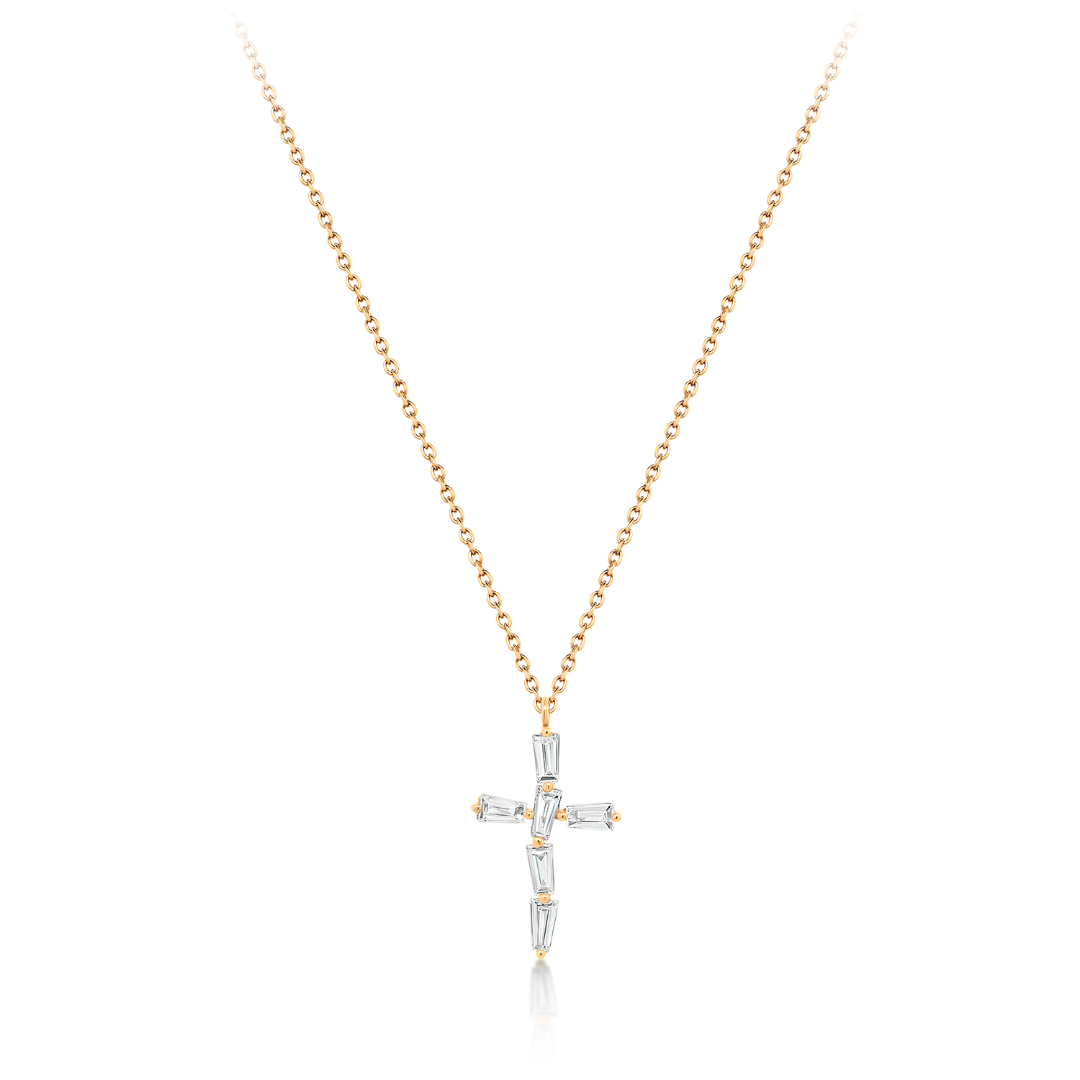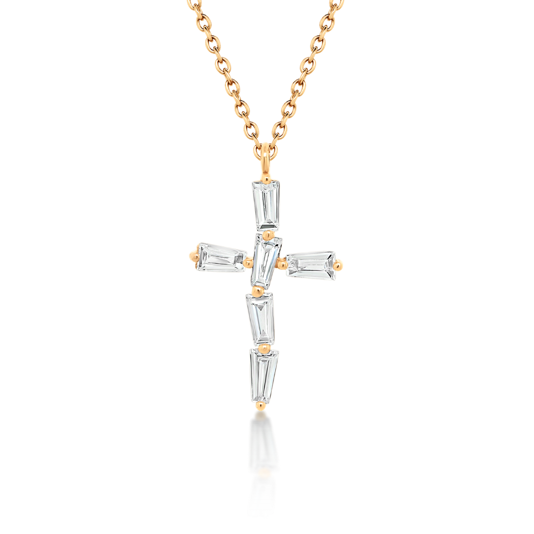 Lanț din aur roz de 18K și pandantiv cruce cu Diamante naturale Tapered Baguette.