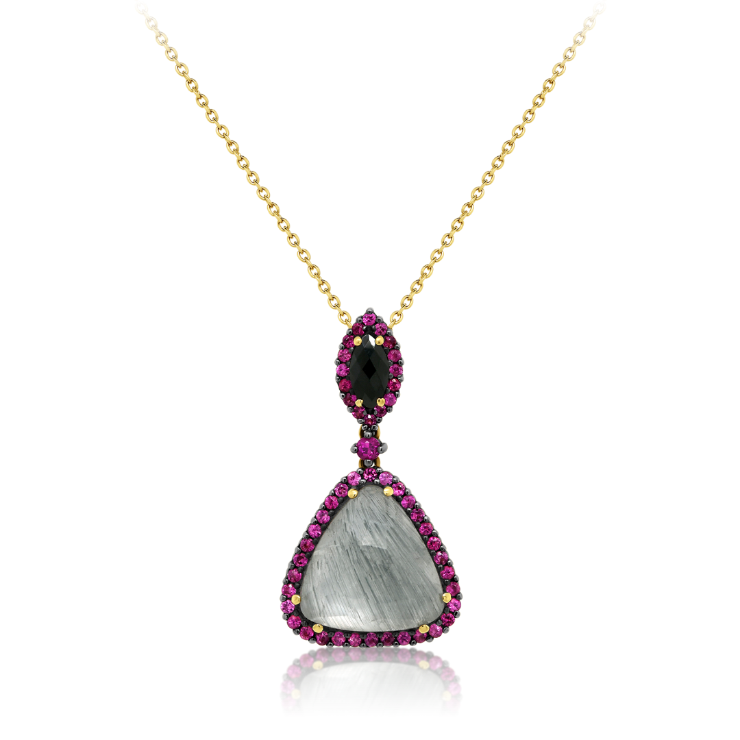 Lanț din aur galben de 18K și pandantiv cu Rubine naturale de 0.68ct, Quartz rutilat și Diamant negru natural de 1.60ct.