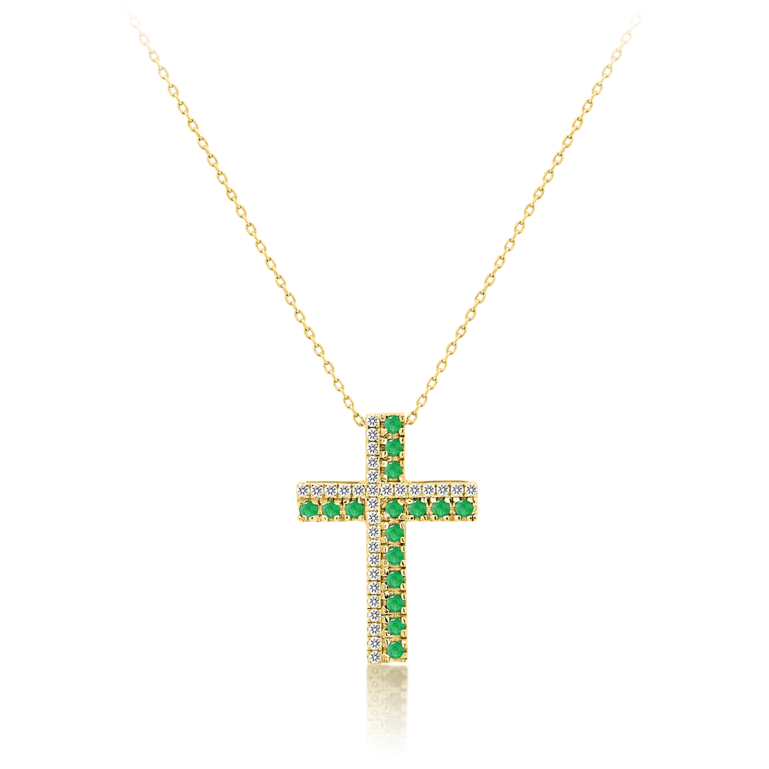 Lanț din aur galben de 18K și pandantiv cruce cu Smaralde și Diamante naturale.