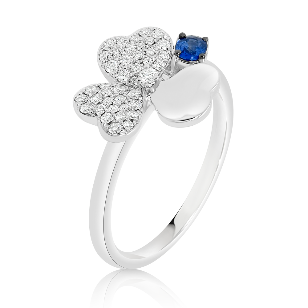 Inel din aur alb de 14K cu element trifoi, încrustat cu Diamante naturale de 0.28ct și Safir.