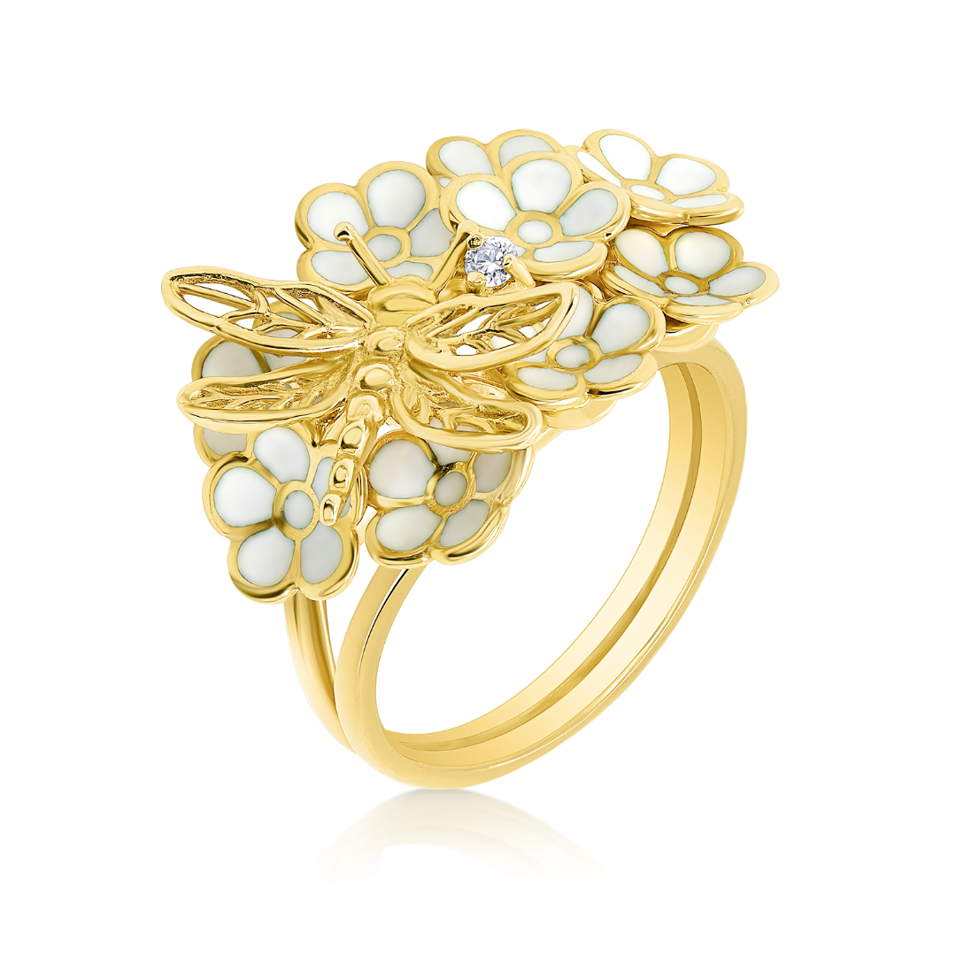 Inel din aur galben de 14K încrustat cu Diamante naturale de 0.03ct, libelulă și flori cu Email.