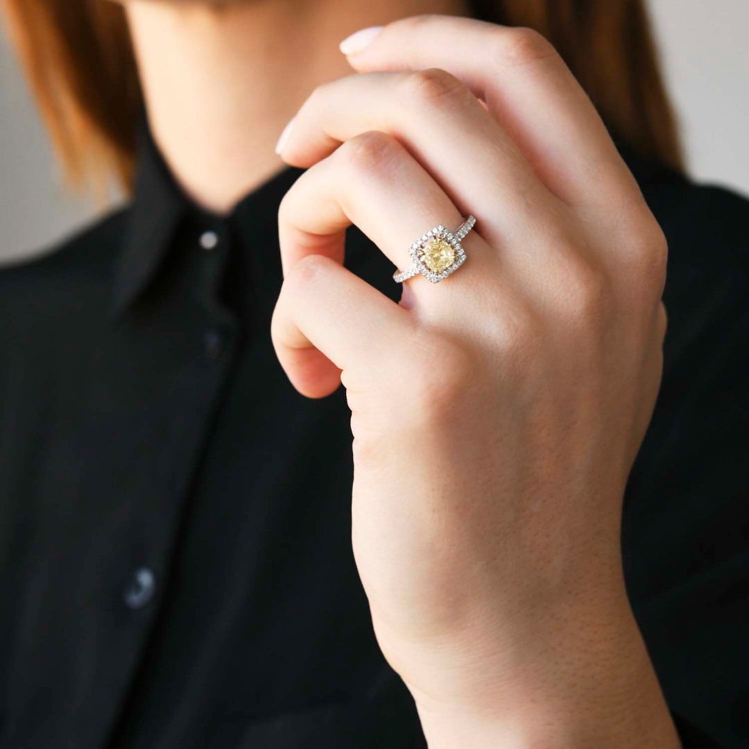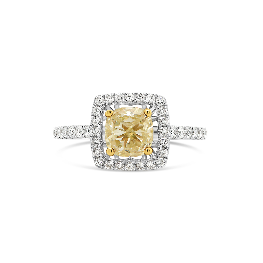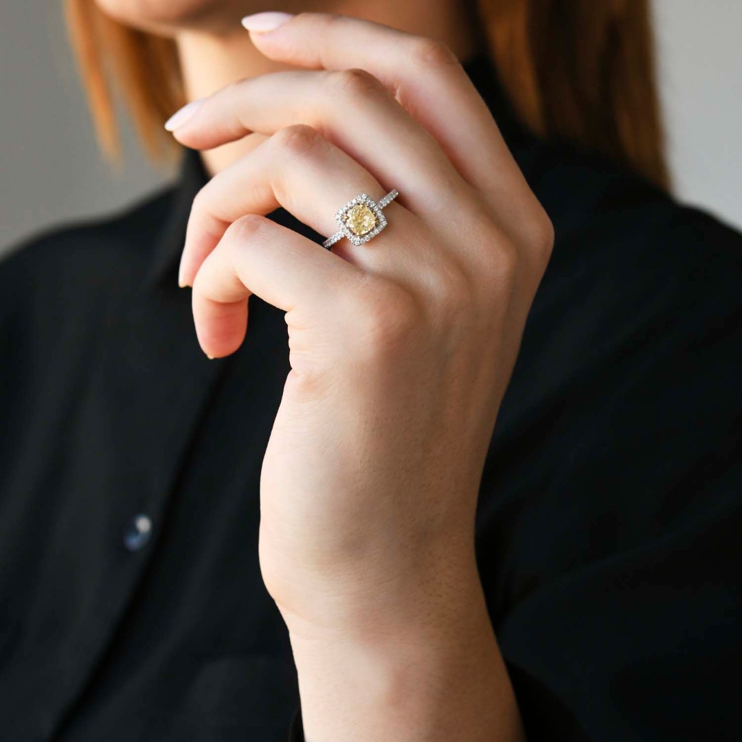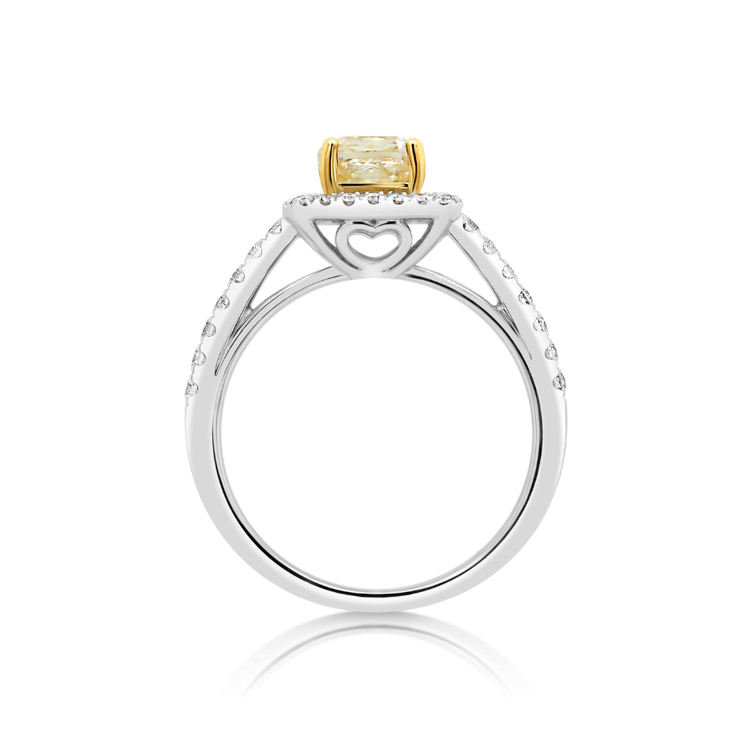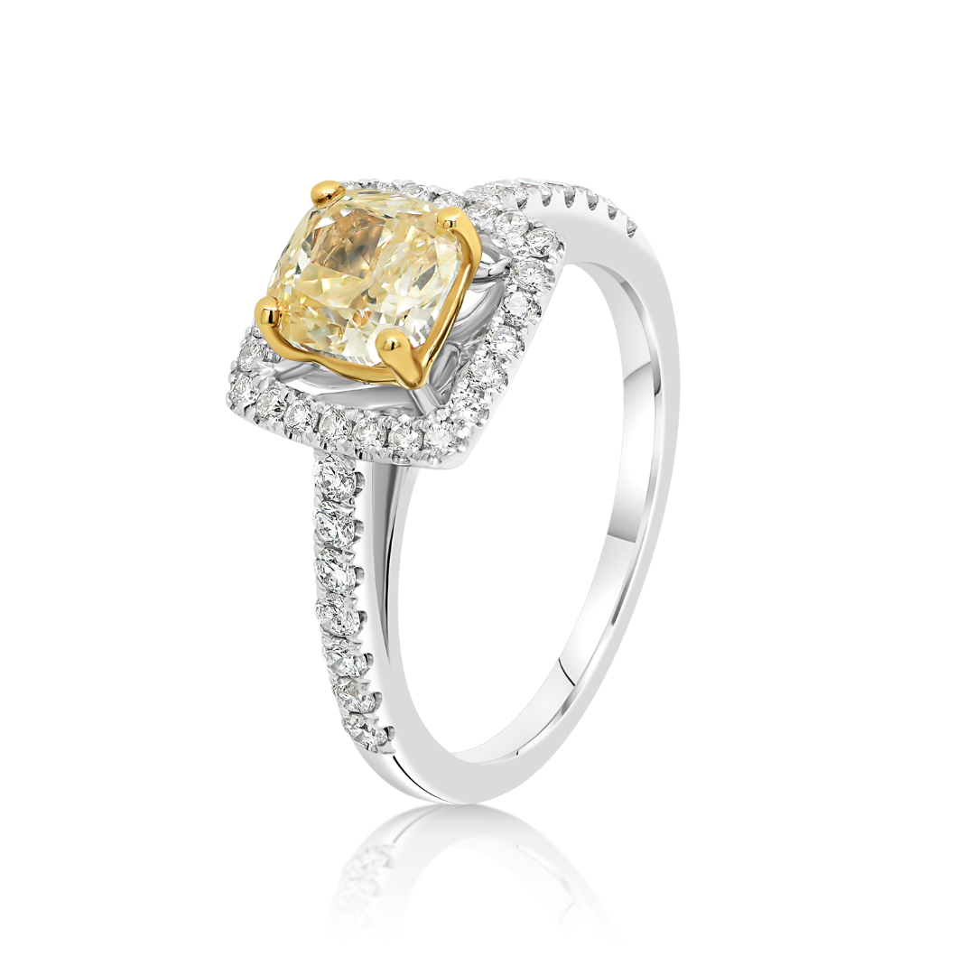 Inel de logodnă din aur alb de 18K, încrustat cu un Diamant galben Cushion certificat la Institutul Gemologic GIA de 1.01ct și 38 de Diamante incolore Round Brilliant de 0.35ct.