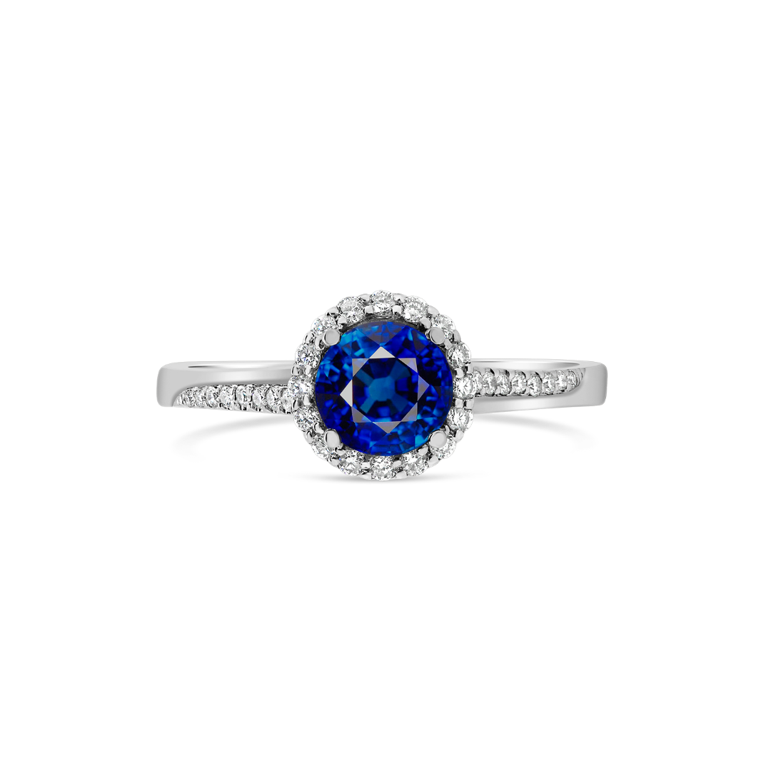 Inel din aur alb de 18K, încrustat cu 32 Diamante de 0.20ct. și un Safir albastru de 0.99ct.