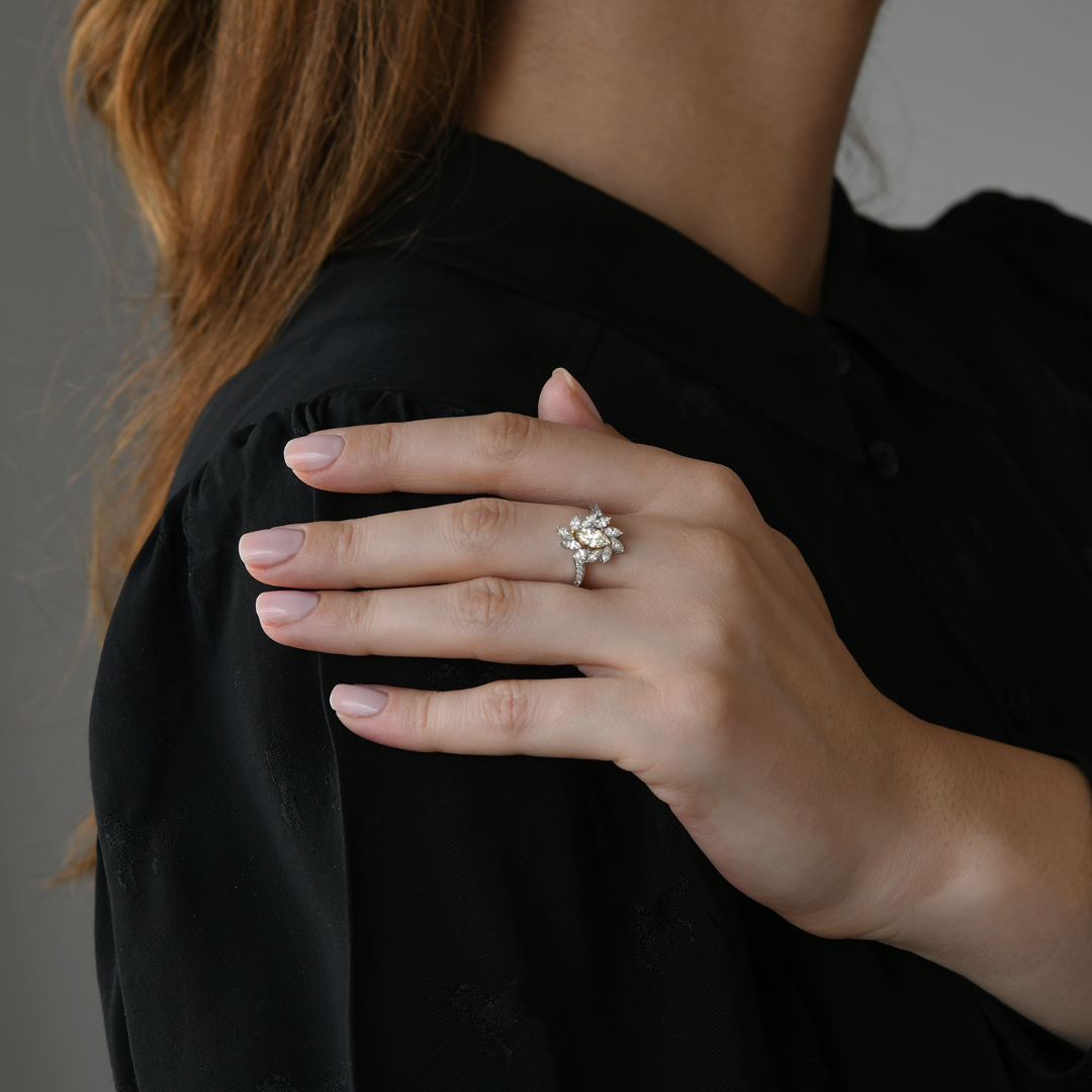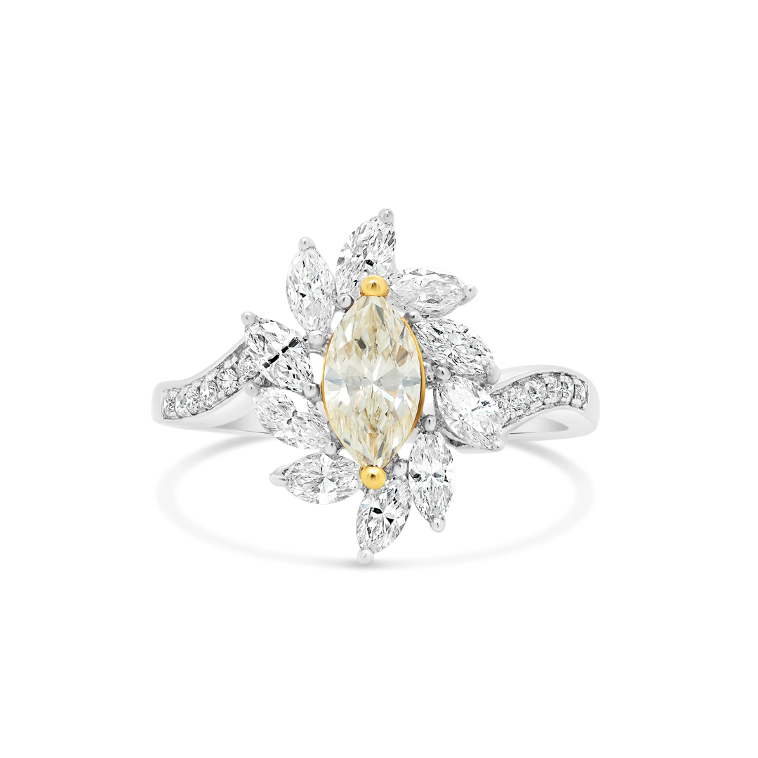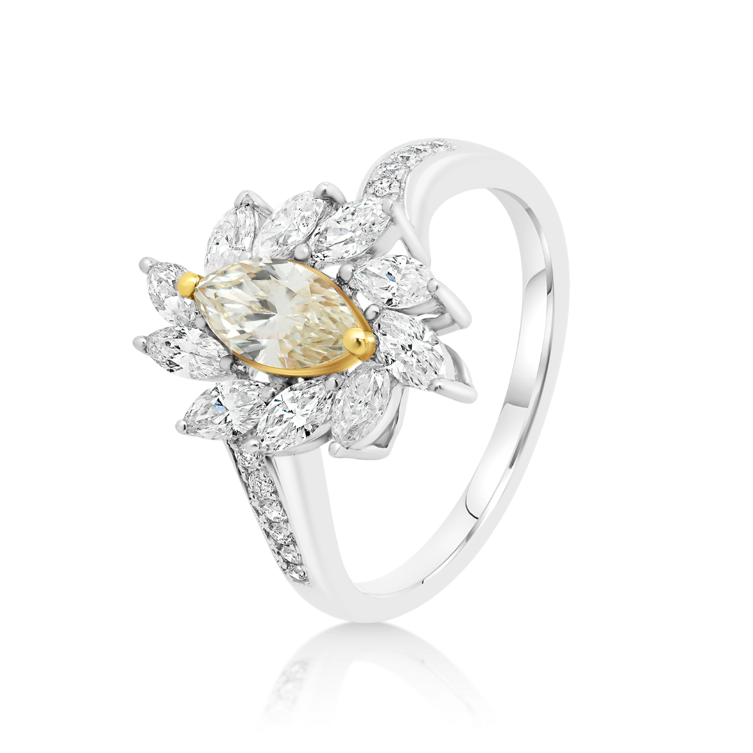 Inel din aur alb de 18K cu un Diamant Fancy Marquise de 0.45ct, 12 Diamante Round Brilliant de 0.08ct și 10 Diamante Marquise de 0.67ct.
