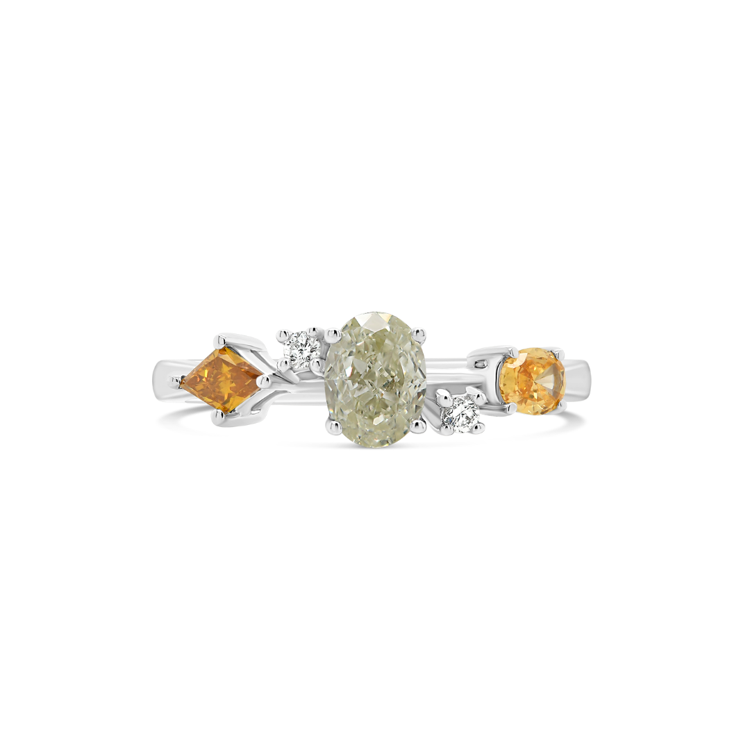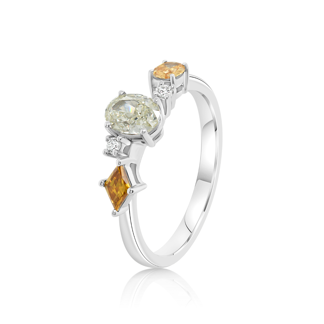 Inel din aur alb de 18K, cu 3 Diamante Fancy de 0.70ct și două Diamante incolore de 0.03ct.