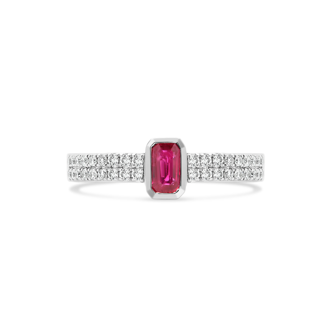 Inel din aur alb de 18K, cu 40 de Diamante Round Brilliant de 0.31ct și un Rubin de 0.26ct.