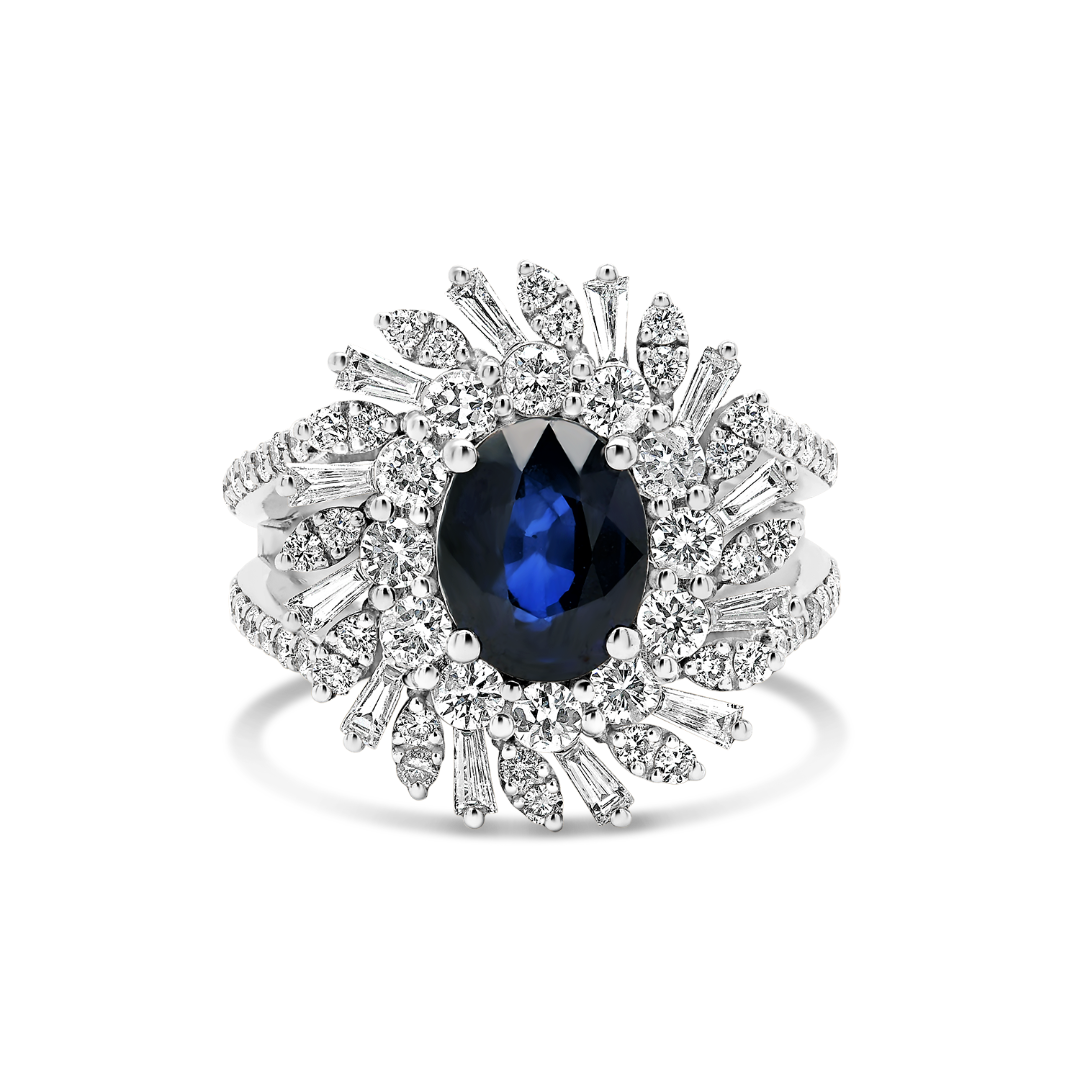 Inel din aur alb de 18K, încrustat cu Diamante Baguette și Round Brilliant de 1.39ct și un Safir albastru de 2.42ct.